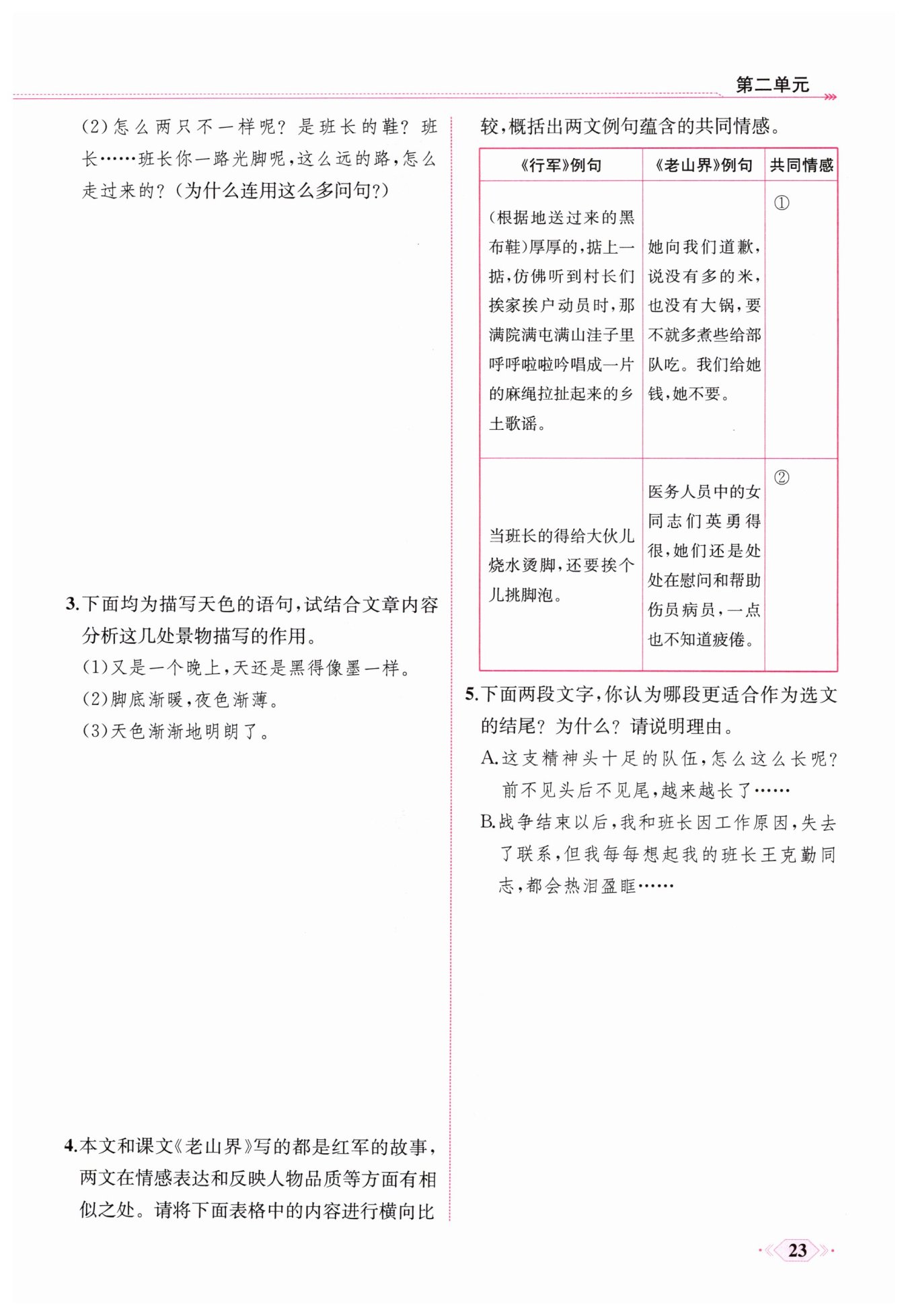 示例:A。这样的结尾不仅照应标题,而且使文章主题更深刻,也给读者带来无限回味和遐想。因为正是有这样乐于帮助战士的班长,有这样全心全意为人民的部队,所以群众才会积极加入到解放军的队伍中,队伍才会更加壮大。同时,这样的结尾也表达出我们的战士对革命胜利充满信心。而B段文字仅仅表现卢守坤对班长的思念,不能深化文章主题。