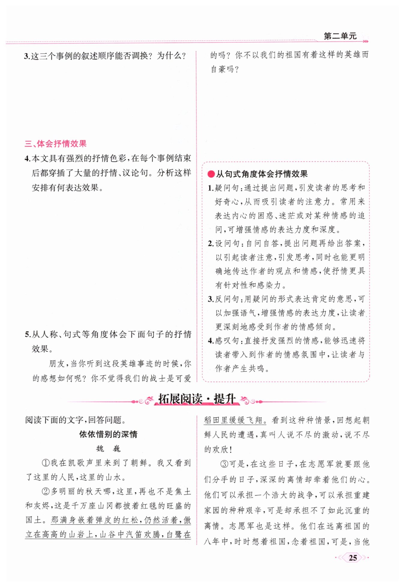 人称角度:使用第二人称“你”,以“朋友”的身份问读者对这段“英雄事迹”的感受,更加自然、亲切,拉近了与读者的距离;具有呼告效果,增强了感染力,将作者对志愿军战士们的敬佩、自豪之情抒发得淋漓尽致。