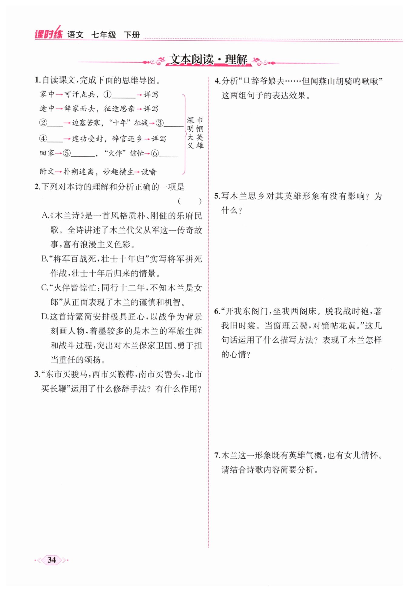 诗中第2、4段描述了木兰决定代父从军,奔往战场,穿越关塞山岭的英勇形象,又写了她在战场上历经一次次战斗,最终胜利归来的英勇善战之姿。这些描绘展现了木兰作为战士的英勇和坚忍不拔。第5段写木兰在立下赫赫战功后,不慕名利,毅然选择辞官还乡,这体现了她高尚的品质。这种淡泊名利、心系家园的情怀,进一步彰显了她的英雄气概。第3段写木兰在奔赴战场的途中思亲,第6段写家人迎接木兰归来的温馨场景,以及木兰回家后的一连串动作,表现了她对家的深切怀念和亲切感受。“脱我战时袍,著我旧时裳。当窗理云鬓,对镜帖花黄”等句,则生动地展现了木兰对女儿装束的喜爱和对美的追求。这些描写细腻地刻画了木兰作为女性的柔情与爱美之心,体现了她内心深处的女儿情怀。