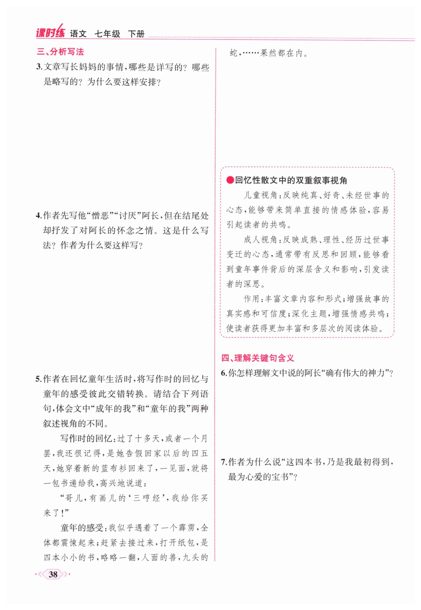 作者既是以儿时的心态回忆阿长的,又是以写作时成人的眼光观照自己的童年和阿长的,但是后一层意味是含蓄的,要透过文字表面去理解。童年的感受使文章富有童趣,成年的视角则使文章充满了温情和深沉的怀念,并揭示出阿长对“我”成长的重要意义。
