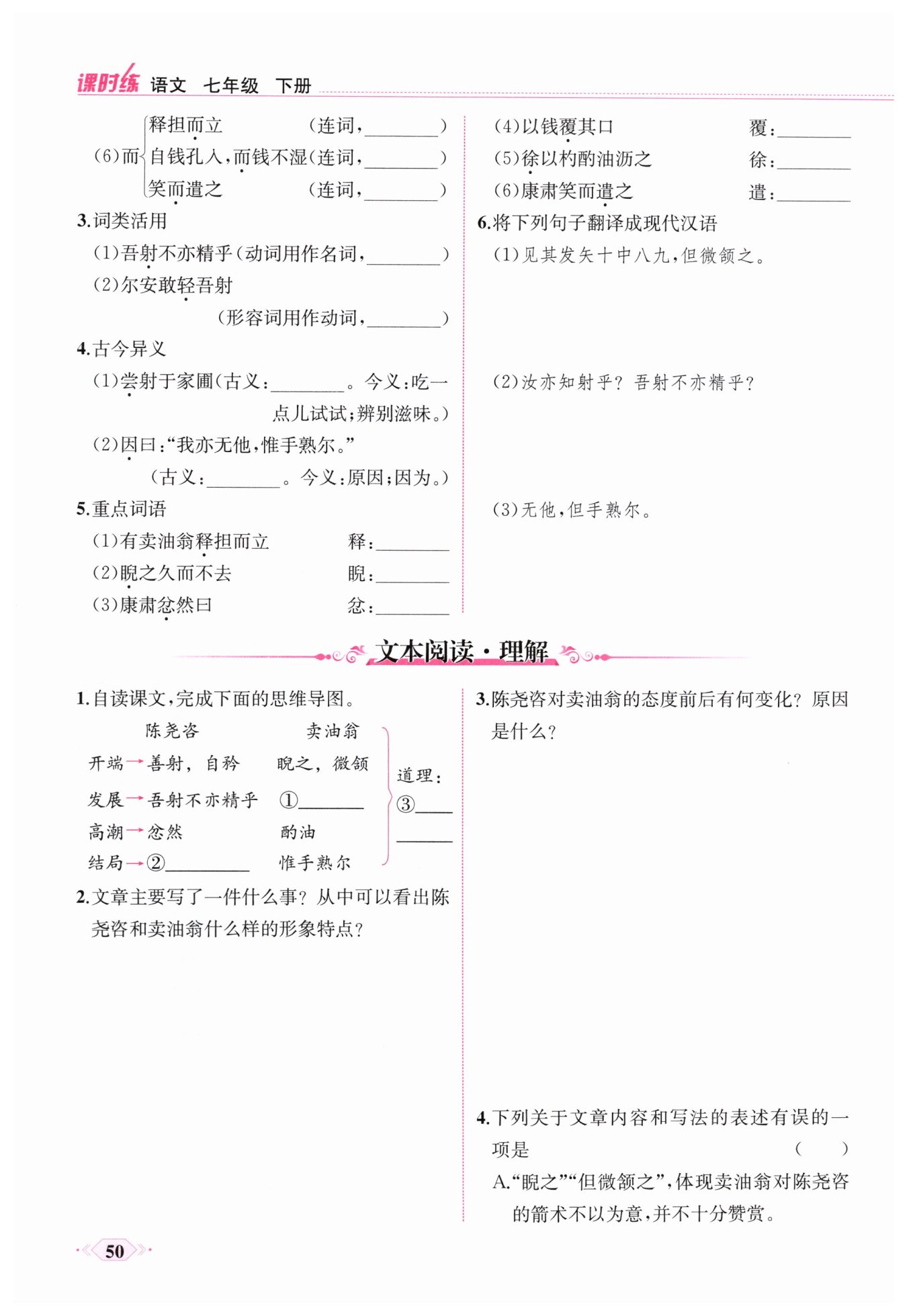 态度变化:从反感、忿然(恼怒)到佩服。变化原因:陈尧咨看到了卖油翁酌油的技术很娴熟,却并不“以此自矜”。