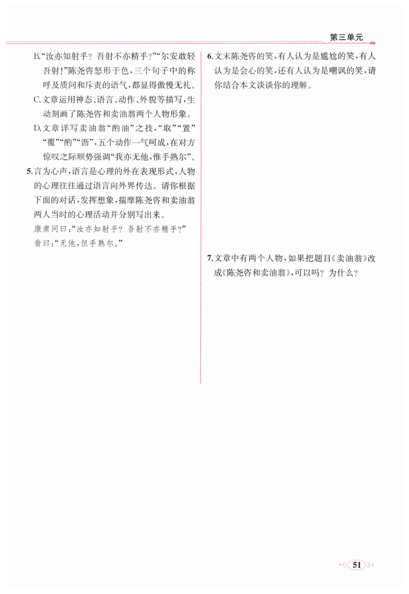 示例:我认为是会心的笑。卖油翁的演示让陈尧咨顿悟,熟练是掌握任何技艺并达到高水平的诀窍。陈尧咨赞同卖油翁的说法,以微笑加以肯定。