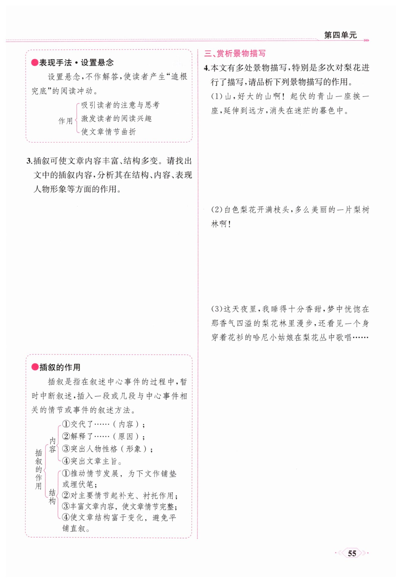 这句话描写梨花盛开的景象,写出了梨树林优美的环境特点,营造出充满诗情画意的意境,烘托出“我”和老余在有了希望、得到安慰时的心情,同时为下文投宿小茅屋作铺垫。