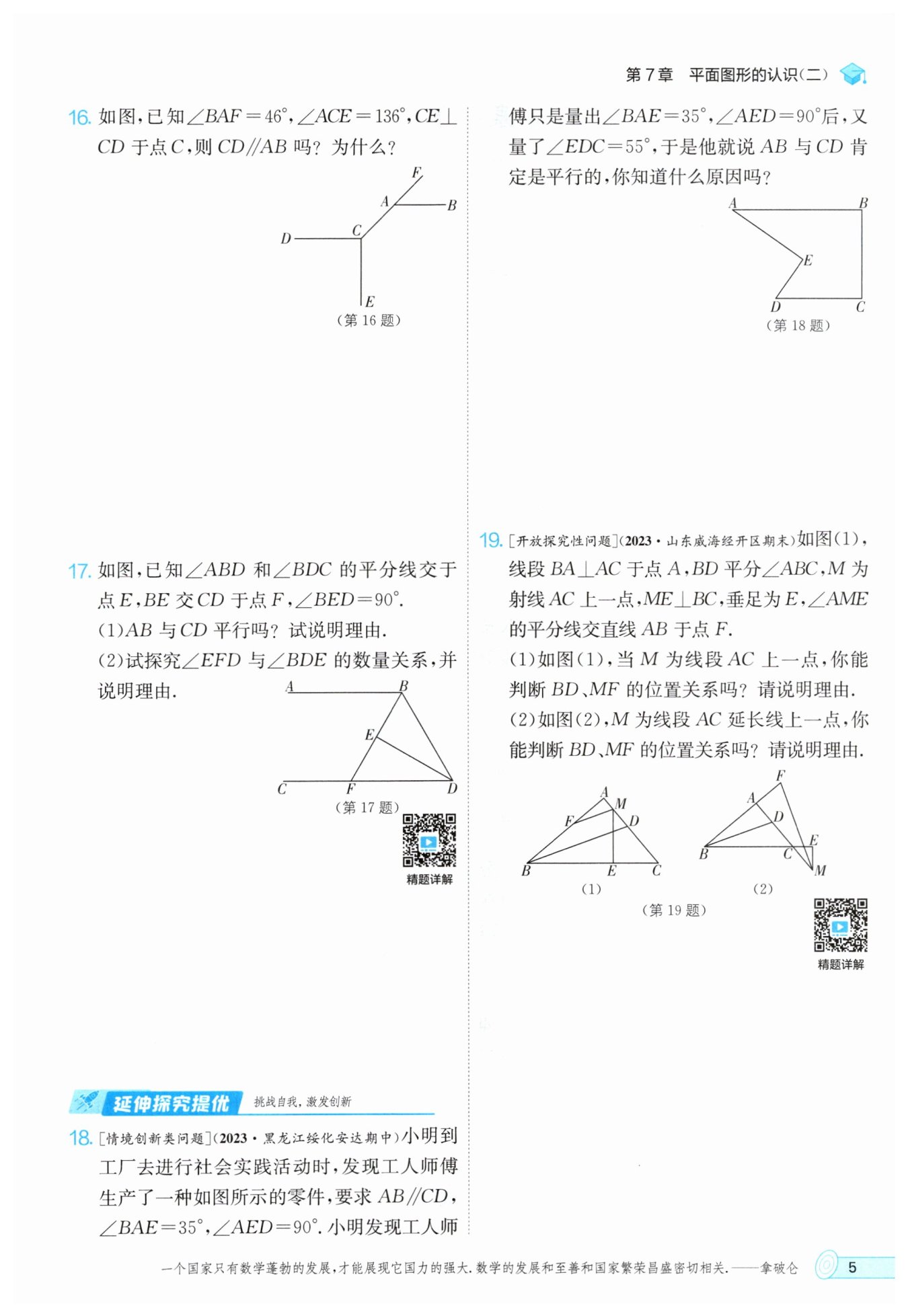 $解:AB与CD平行.$ $理由如下: $ $如图,延长AE交DC于点M. $ $∵∠AED=90°,∠EDC=55°,$ $ \begin{aligned}∴∠AMD&=180°-90°-55° \\ &=35°. \\ \end{aligned}$ $∵∠BAE=35°,$ $∴∠BAE=∠AMD,$ $∴AB//DC.$