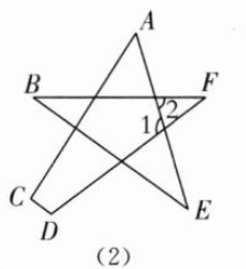 $解:如图(2).$ $∵180°-∠1=180°-(∠2+∠F), 180°-∠2=180°-(∠B+∠E),$ $∴∠1=∠2+∠F=∠B+∠E+∠F.\ $ $又∠1+∠A+∠C+∠D=360°,\ $ $∴∠A+∠B+∠C+∠D+∠E+∠F=360°.$