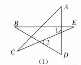 $解:如图(1).$ $∵180°-∠1=180°-(∠2+∠D), 180°-∠2=180°-(∠B+∠E),$ $∴∠1=∠2+∠D=∠B+∠E+∠D.$ $又∠1+∠A+∠C=180°,$ $∴∠A+∠B+∠C+∠D+∠E=180°.\ $