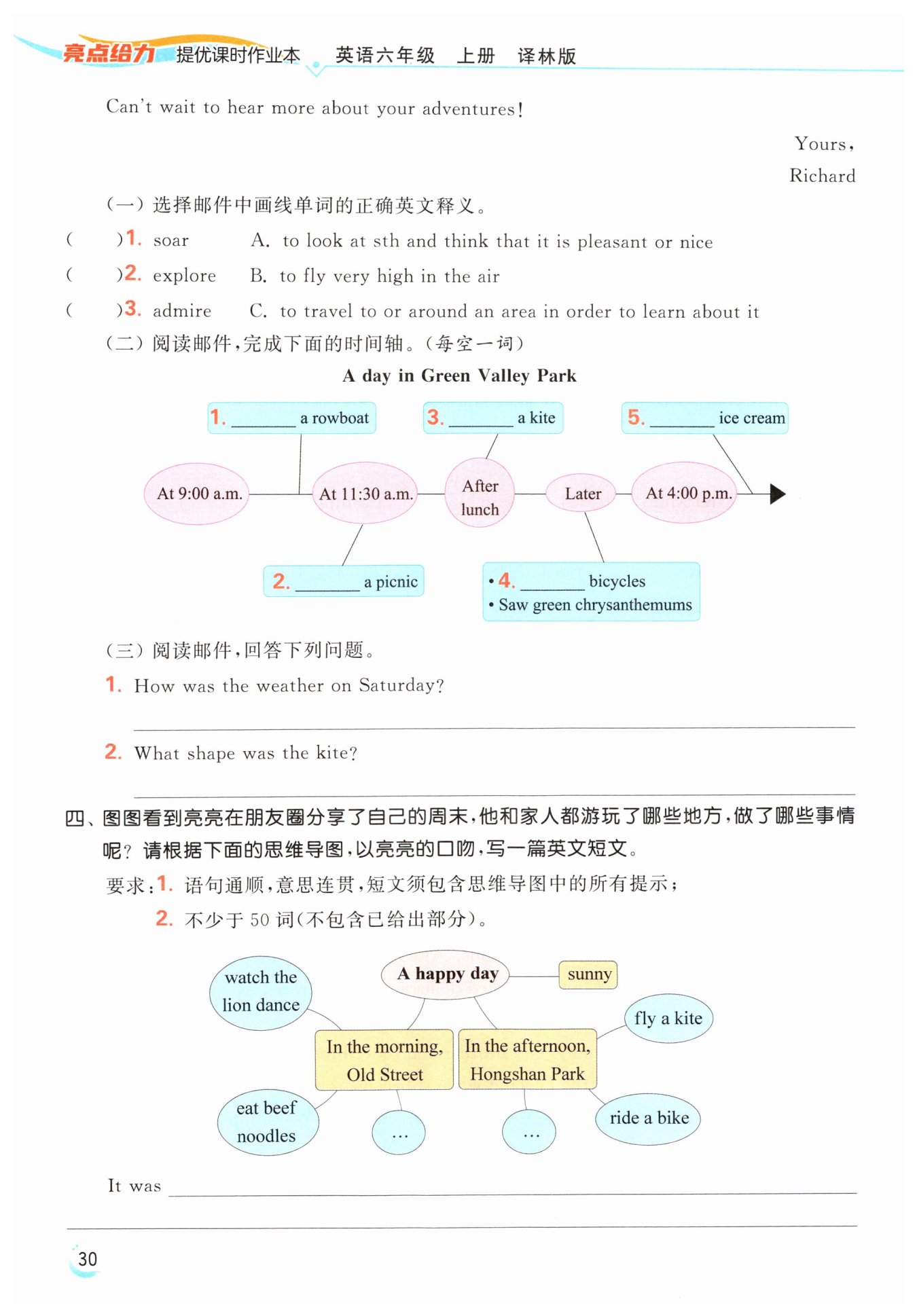 It was sunny on Saturday. In the morning, we went to the Old Street. The buildings there were interesting. We watched a lion dance and ate delicious beef noodles there. In the afternoon, we visited the Hongshan Park. I flew a kite with my father in the park. My mother stood by and took some pictures for us. After that, I rode a bike in the park with my parents. We all had a happy day.