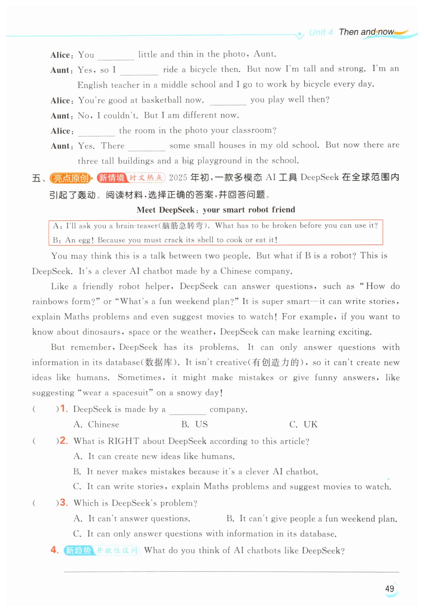 I think AI chatbots like DeepSeek are cool! They can explain Maths problems and write interesting stories! (答案不唯一)