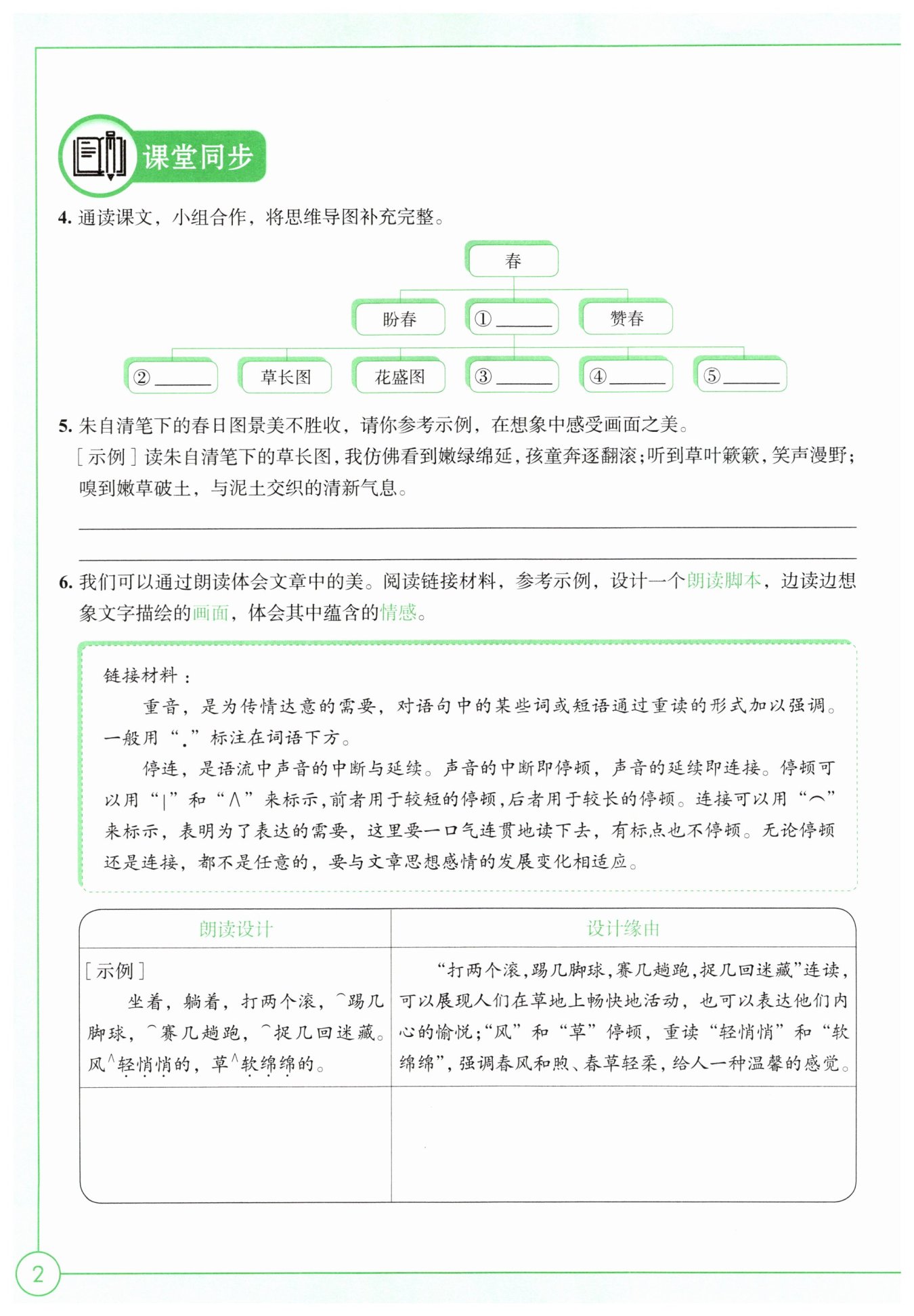 “山”“水”和“太阳的脸”后停顿,重读“朗润”“涨”“红”,可以凸显春天苏醒时万物欣欣向荣的景象,表现人们愉悦的心情。