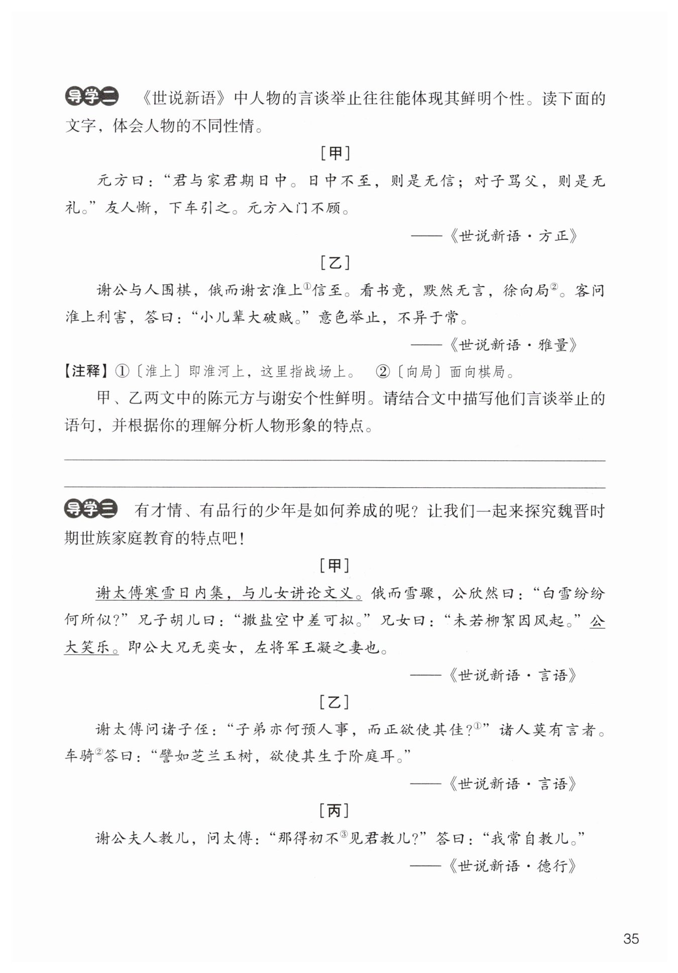 理有据,展现了元方懂礼识义的一面;元方“入门不顾”的行为,维护了父亲和自己的尊严,展现了元方正直率真的一面。当谢安得知晚辈大胜的消息后,“默然无言,徐向局”,从容淡定地与客人下棋,“意色举止,不异于常”,展现了谢安宠辱不惊、镇定自若的名士风采。