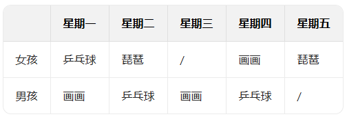 解析:表格中周三女孩、周五男孩对应的课外活动栏为“/”,说明不是每天都有课外活动,所以不相符。