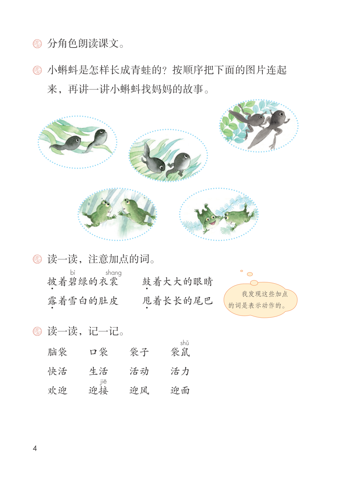 我发现这些加点的词是表示动作的。这四个短语都是由一个动词加上一个词组构成的。读的时候,“披、鼓、露、甩”语气要重一些。而“碧绿的、大大的、雪白的、长长的”这些形容词要读得轻柔且语速慢些。