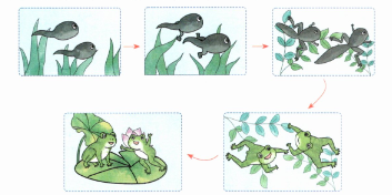 小蝌蚪先长出了两条后腿;过了几天,长出了两条前腿;又过了几天,尾巴变短了;最后尾巴不见了,变成了能捉害虫的青蛙。