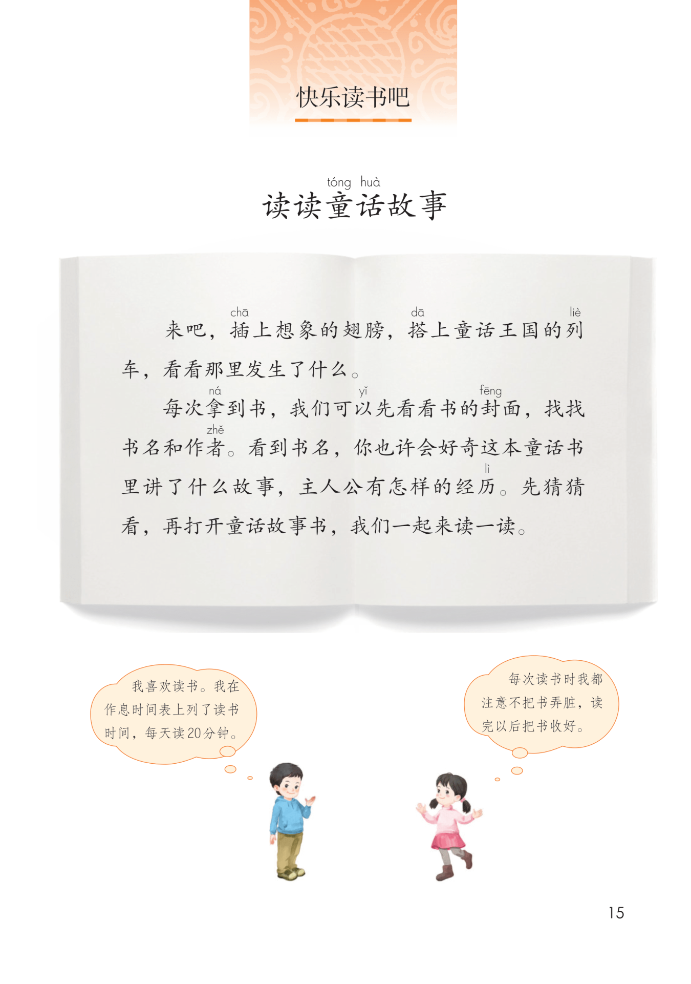 或者家长说说自己看书名猜到的故事内容,以及自己的其他发现。这是我们第一次阅读比较长的童话故事