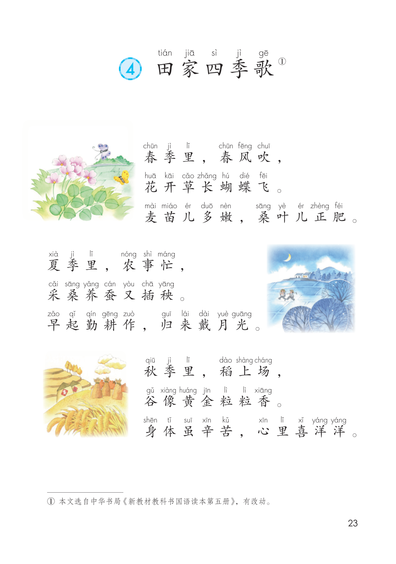 四季—四时 耕作—耕种 归来—回来 辛苦—辛劳 喜洋洋—乐滋滋 笑盈盈—笑呵呵