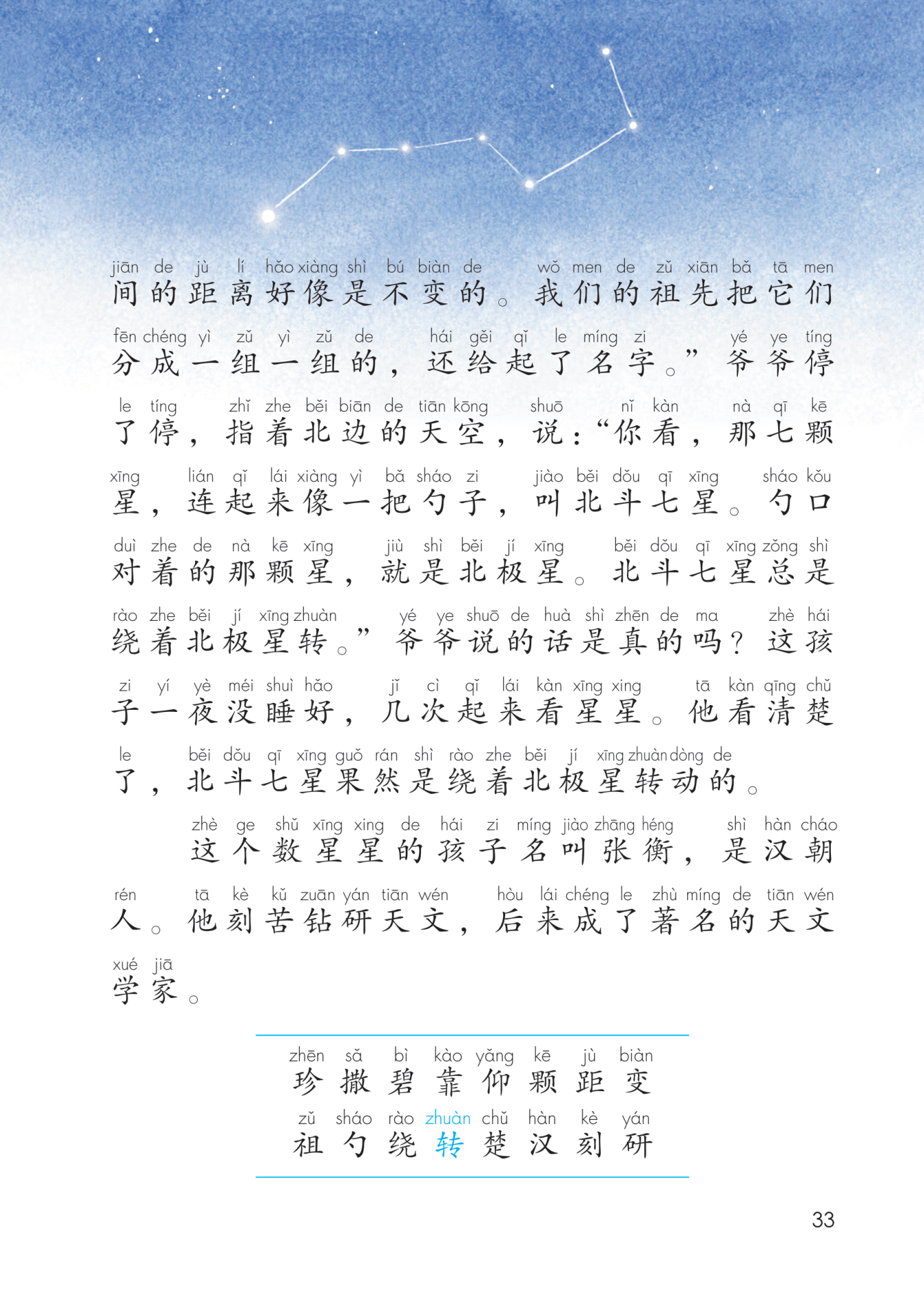 从爷爷的话语中,我们获取了有关“北斗七星”“北极星”的相关知识、也为张衡观察星星提供了重要的科学信息。