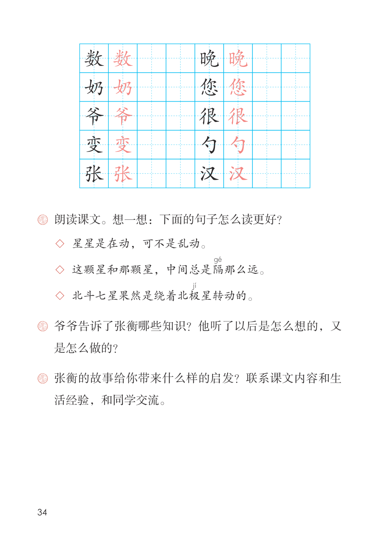 爷爷告诉张衡星星一直是运动着的,但星星之间的距离是大致不变的;