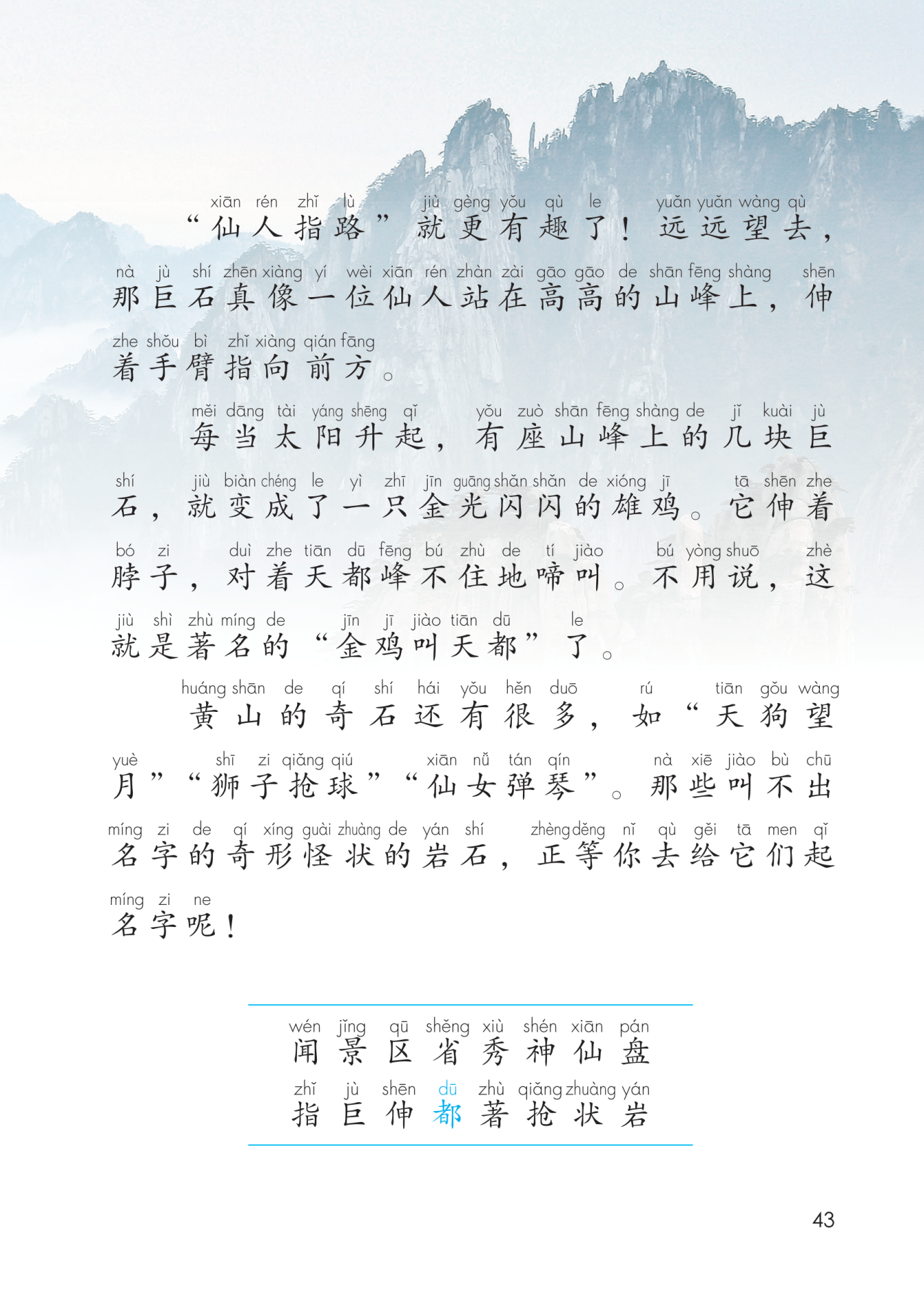 介绍了“仙人指路”的位置和样子。一个“仙”字给这块石头蒙上了神奇的色彩,使人觉得有趣极了。
