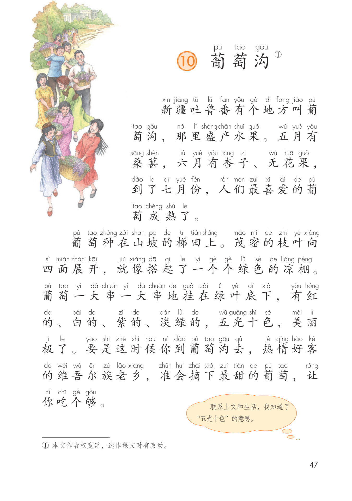 “一大串一大串”强调葡萄多,串大,产量高。“五光十色”写出了葡萄的颜色多、品种多、品质好(串大、颗粒饱满光亮)。