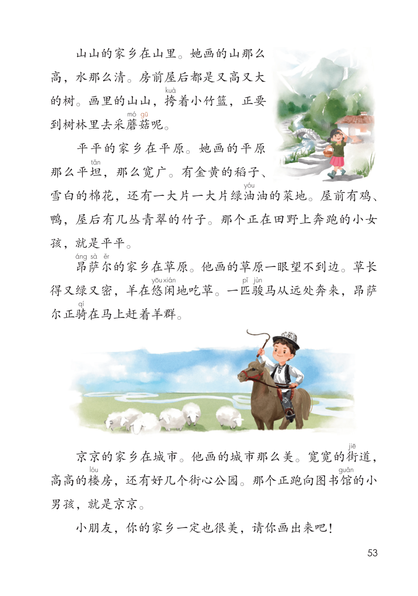 本文写生活在海边、山里、平原、草原和城市里的五个小