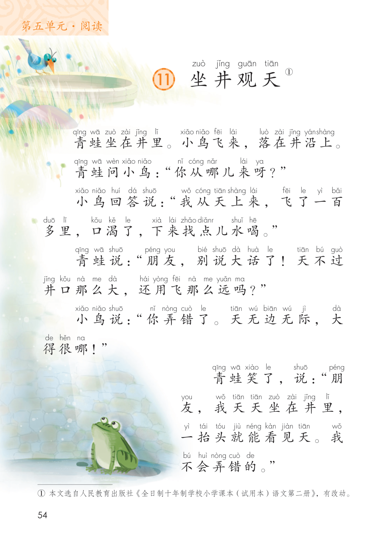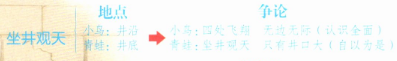 “坐”“落”两个动词写出了青蛙和小鸟的不同位置,点明它们认识不同的原因,也为下文的争论作铺垫。