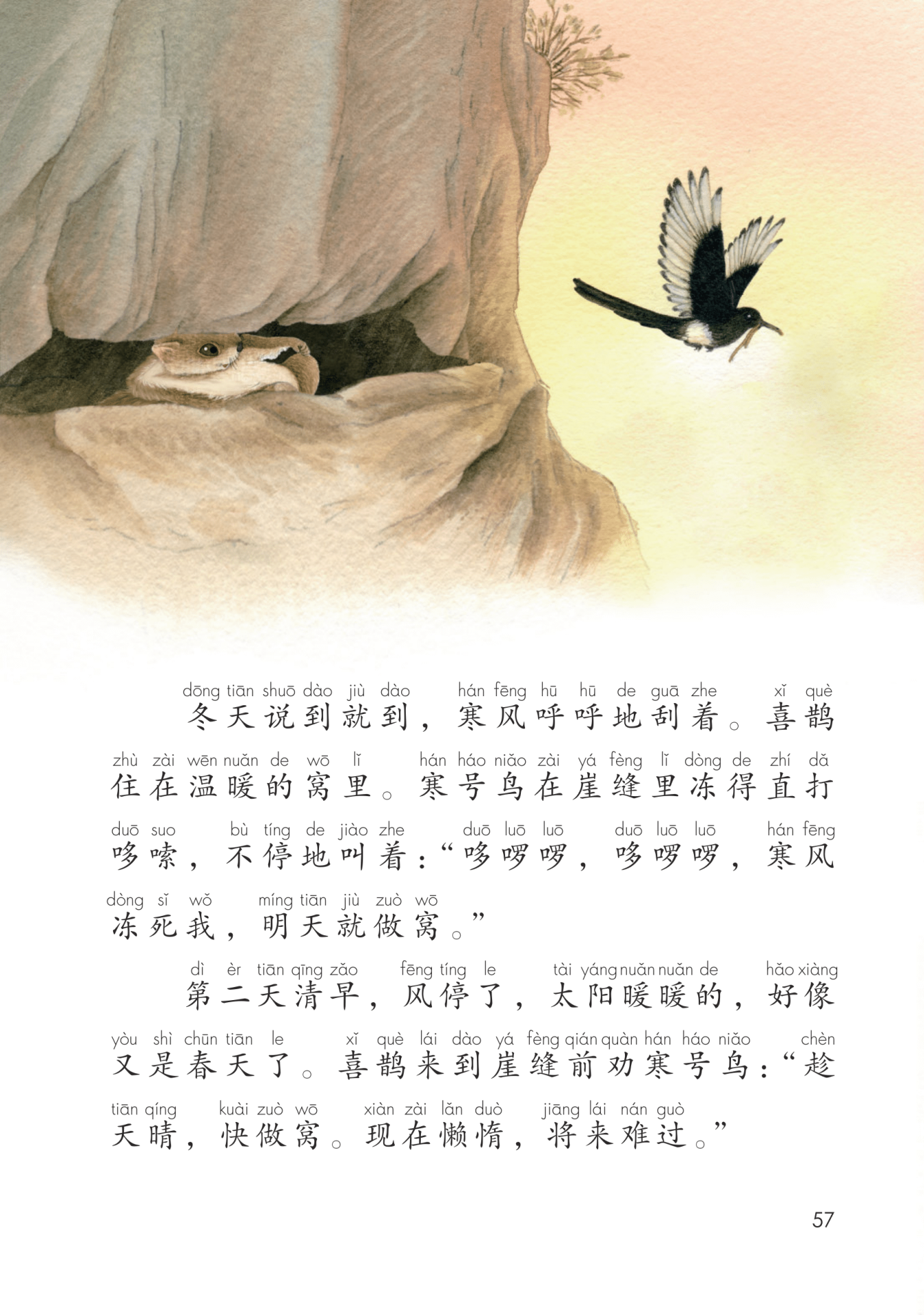 【品词】“温暖”“打哆嗦”写出了寒风中喜鹊和寒号鸟截然不同的处境。这下,寒号鸟该吸取教训了吧!