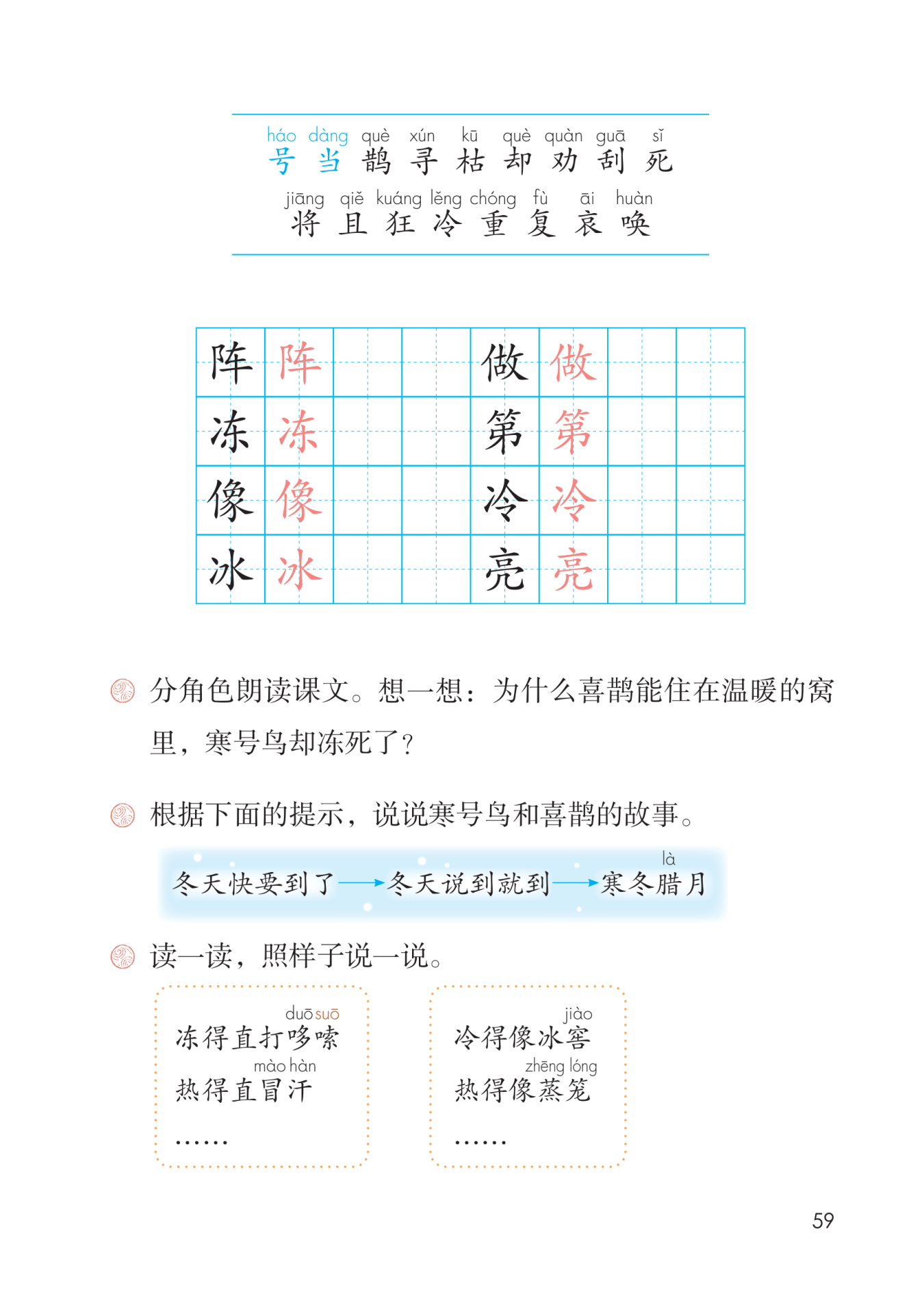 点拨:在根据每一个提示说的时候,注意将寒号鸟和喜鹊的不同做法分别说出来,以