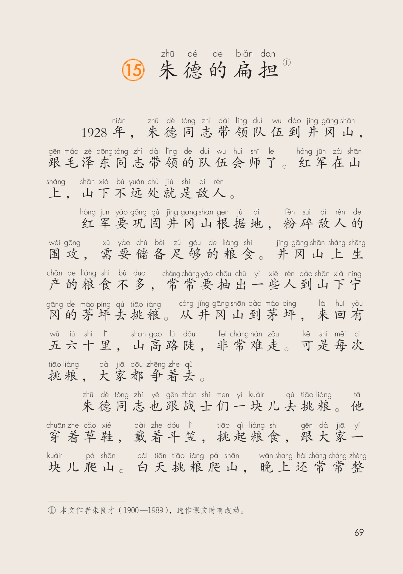 中心思想:这篇课文讲述了朱德同志和红军战士们一起挑粮的故事,赞颂了朱德同
