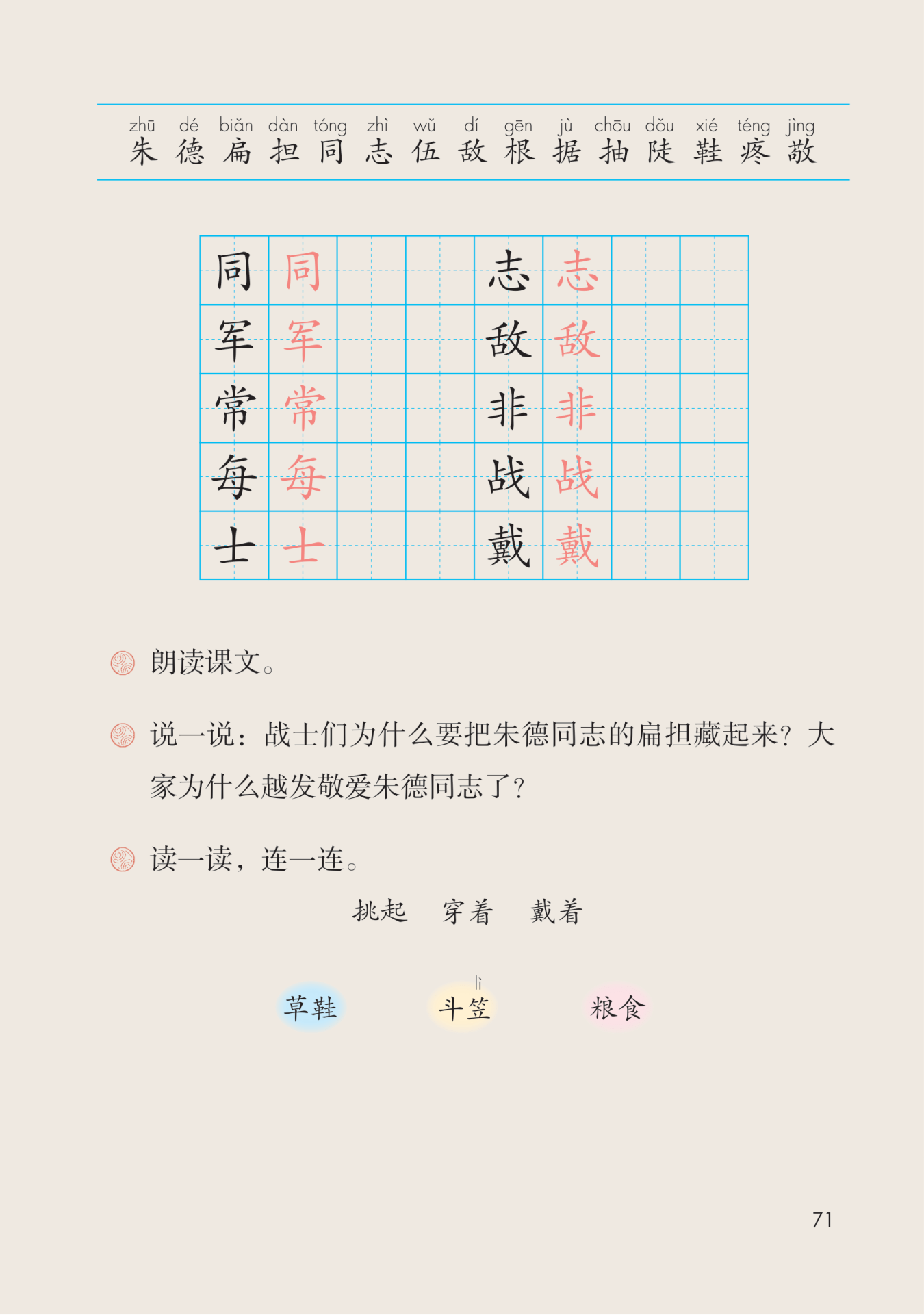 点拨 第一行的词语是表示人物动作的词语,是动词;第二行是表示事物名称的词语,是名词。把对
