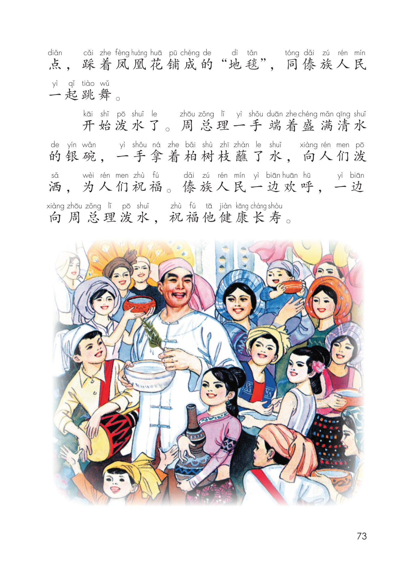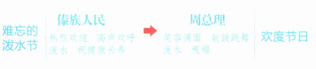 “一边……一边……”表现了傣族人民和周总理一起过节的兴奋和激动。“欢呼”“祝福”写出了傣族人民对周总理的敬爱。