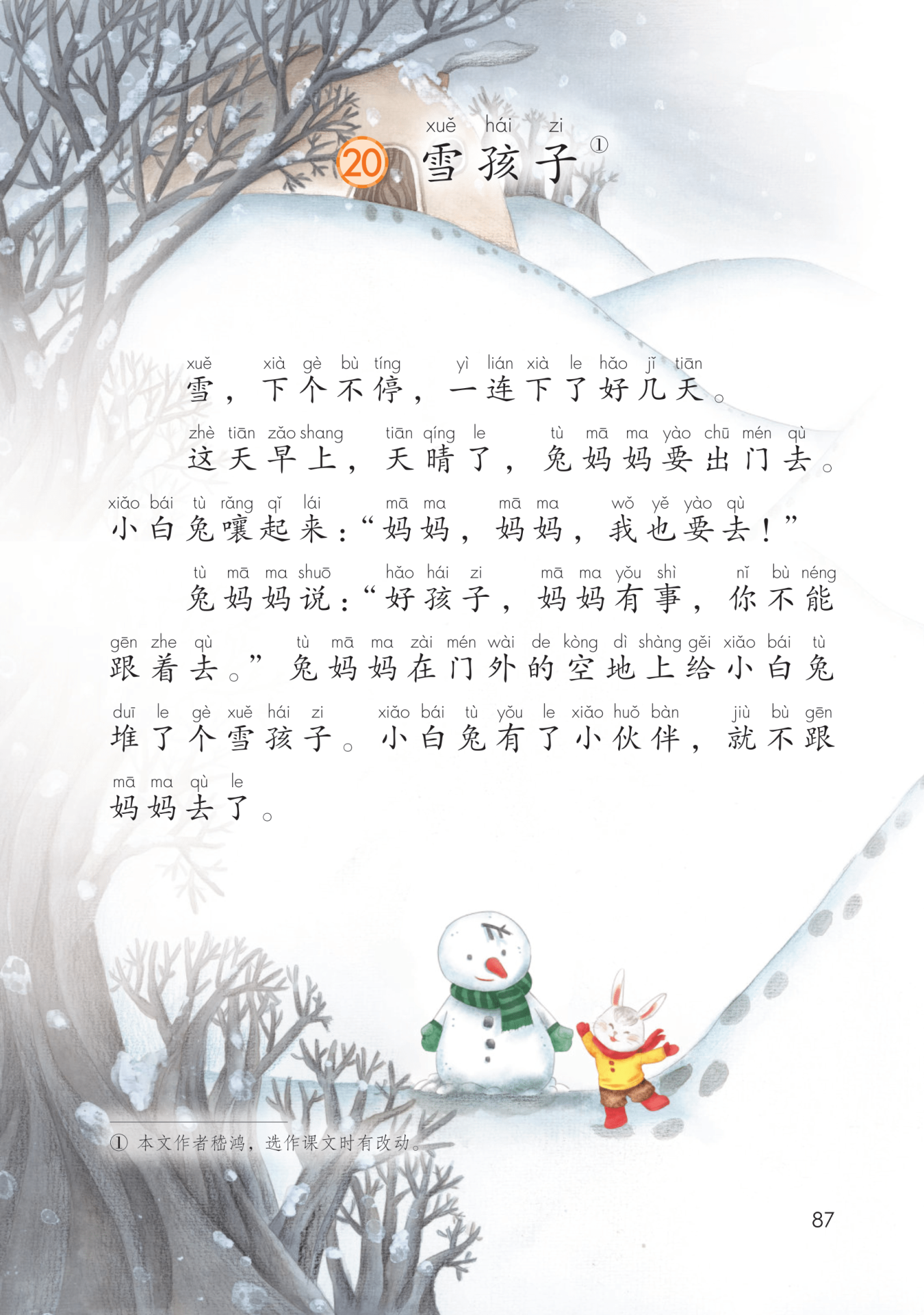中心思想:本文是一篇童话故事,通过讲可爱的雪孩子在兔妈妈离家后