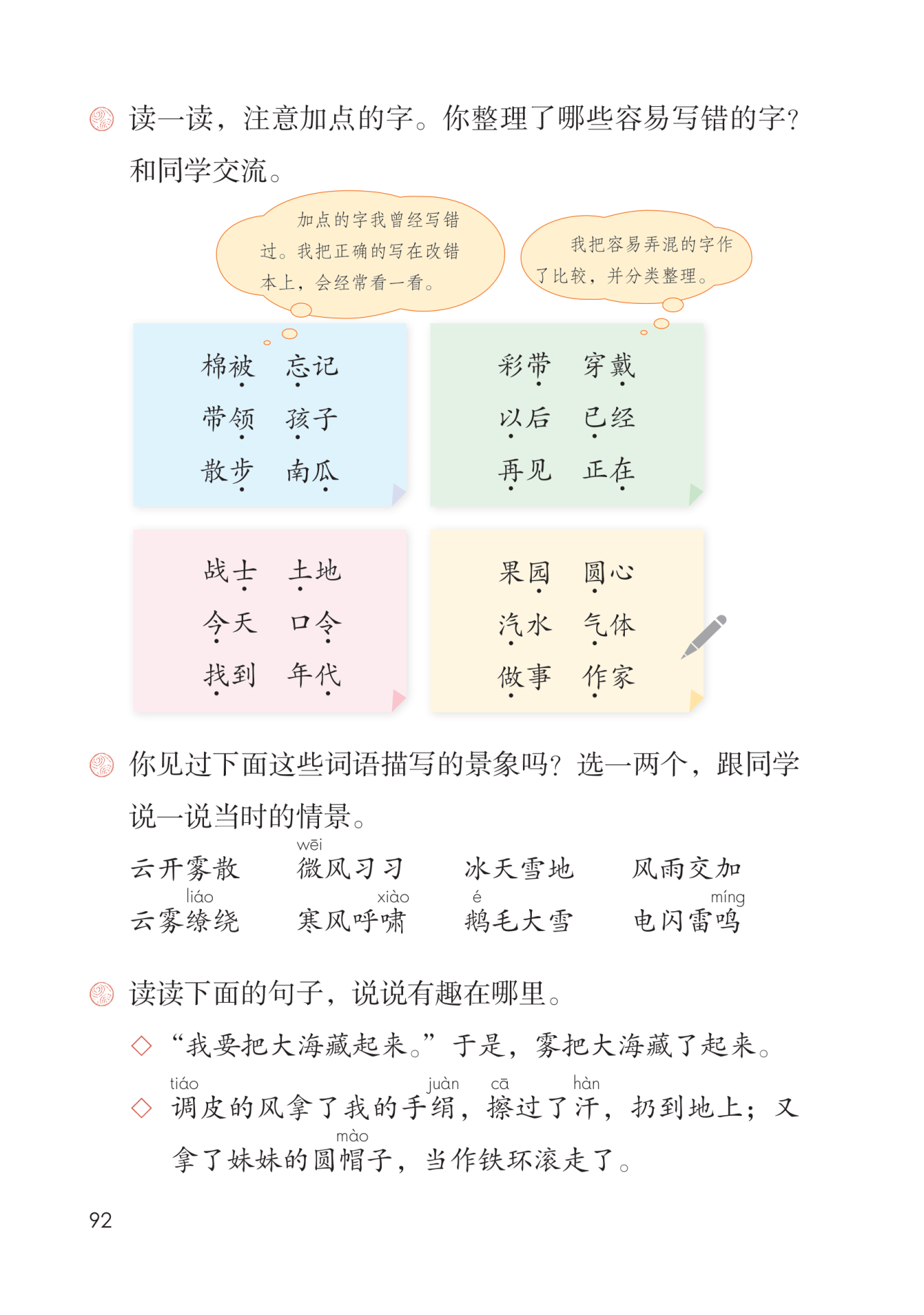 点拨:第一组加点的字中,“被”的部首是“衤”,不要写成“礻”;“忘”的上部最后一笔不加点;“领”的左边是“令”,不要写成“今”;“孩”左部是“孑”,不要写成“子”;“步”的下面不是“少”;“瓜”不要写成“爪”。第二组中,“带”与“戴”“以”与“已”“再”与“在”,它们分别是三组同音字,我们可以用组词、写句子的方法来记住它们。第三组中,“士”的第二横短,“土”的第二横长;“今”没有点,“令”的下面有点;“找”是“扌”旁,右部最后一笔是“㇏”,“代”是“亻”旁,最后不加“㇏”。第四组中,“园”与“圆”“汽”与“气”“做”与“作”,这三组加点字,虽然读音相同,字形也差不多,但是它们的意思不同。