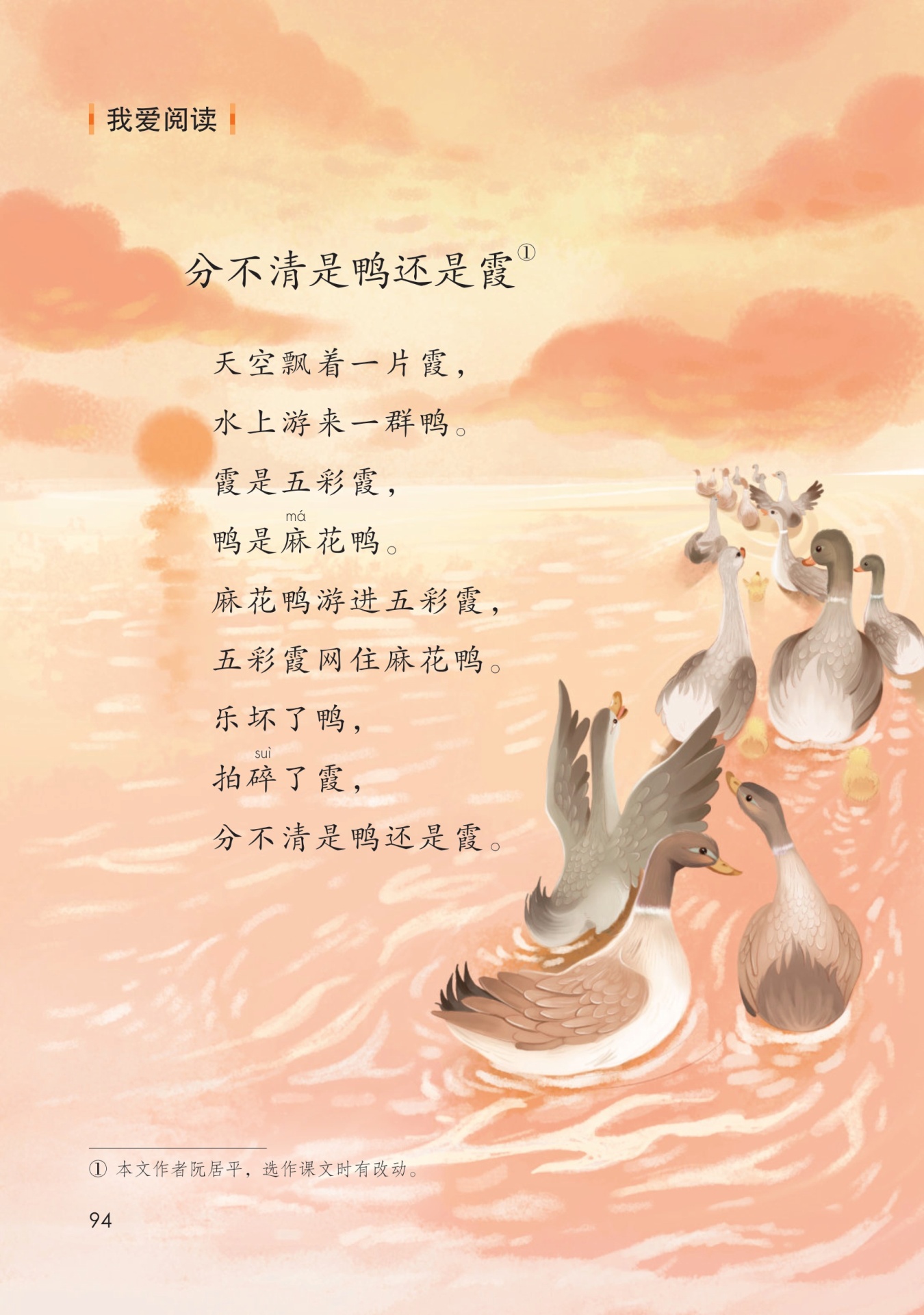 这是一首绕口令,在朗读中辨别“霞”和“鸭”。这