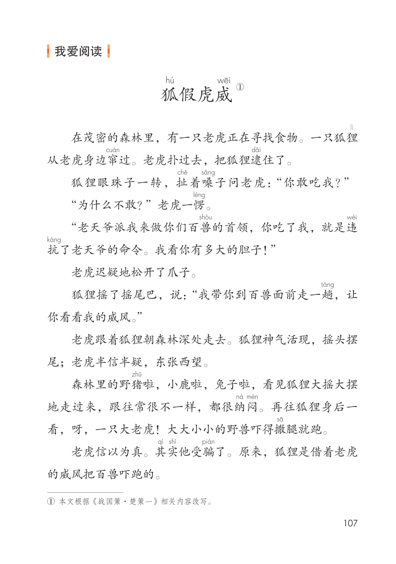 这是一个寓言故事,讲了狐狸借着老虎的威风,吓跑
