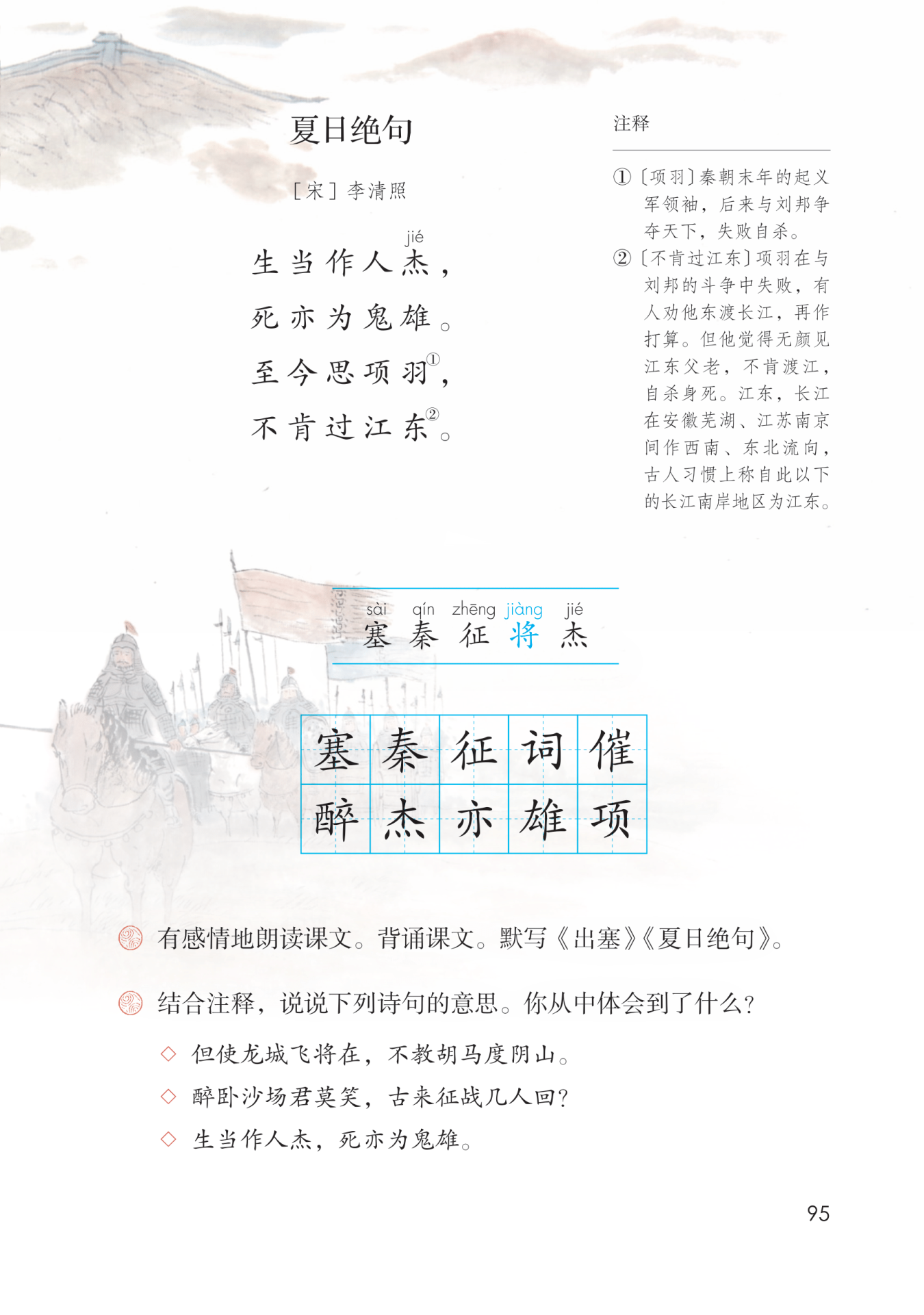 中心思想:《夏日绝句》这首诗借古讽今,借赞颂项羽宁死不屈的英雄气