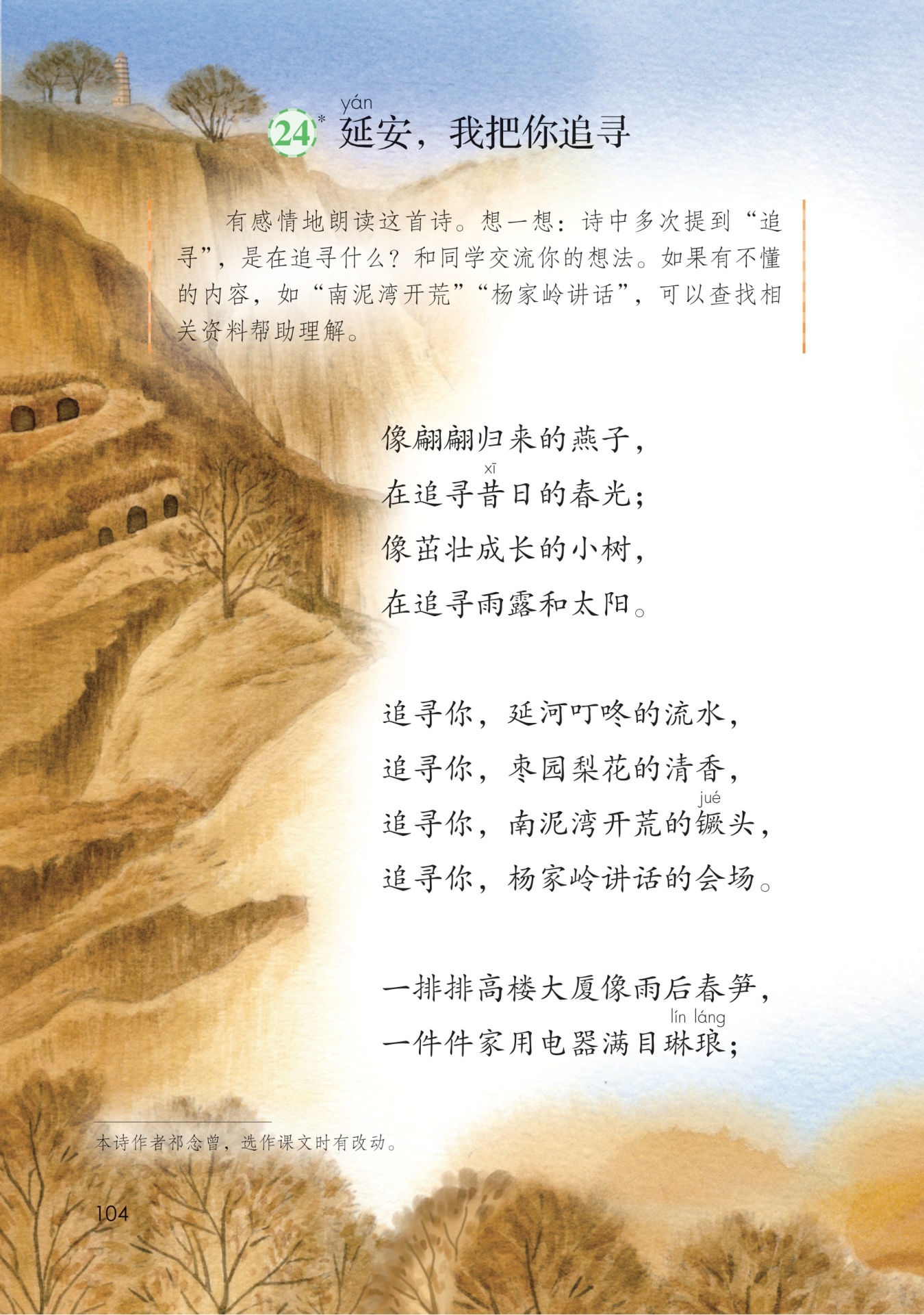 这一段用的是借代的手法。讲“叮咚的流水”,实际上是讲人们在延安度过的革命岁月。讲“梨花的清香”,实际上是讲毛主席等中央领导同志在这里从事的革命活动。“开荒的镢头”代表的是大生产运动中所体现的自力更生、艰苦奋斗的精神。“讲话的会场”代表的是毛主席和党中央对中国革命的正确领导。这四句诗表达了诗人对追寻和继承延安精神的迫切心情。