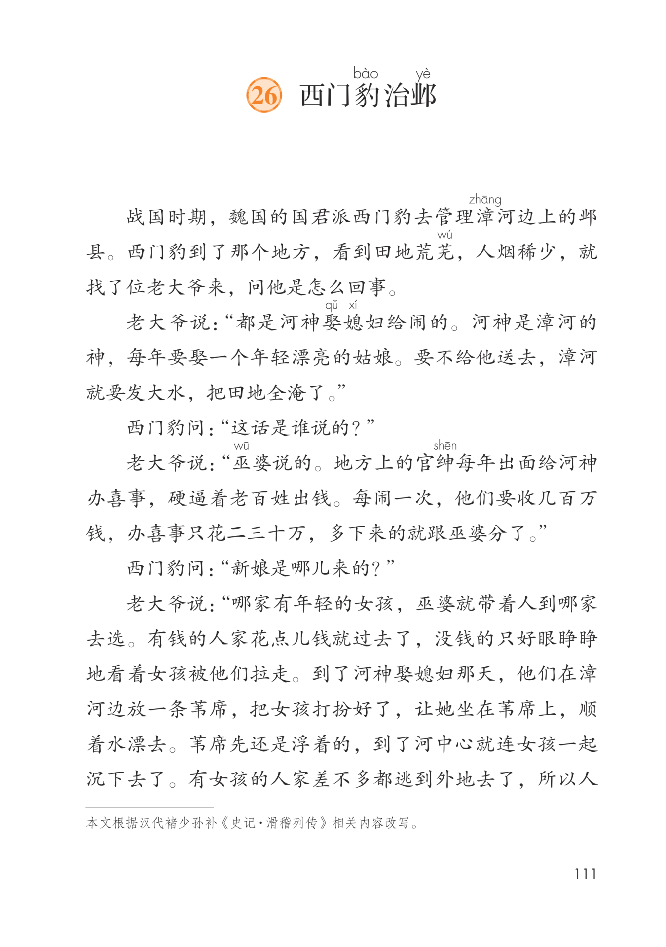 育官绅和百姓破除迷信,并且开凿水渠,造福百姓的故事,赞扬了西门豹尊