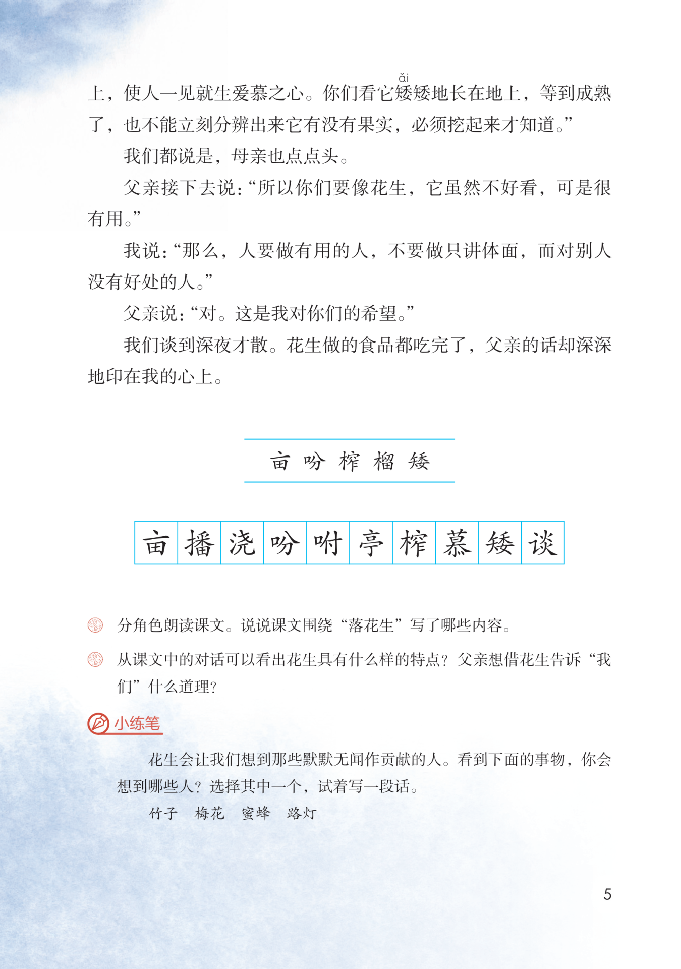 这是父亲对花生的第二次评论。从中可以体会到父亲对“我们”的谆谆教导,殷切希望“我们”像花生一样做一个有用的人,虽然外表不美,却有内在美——默默无闻,毫无怨言,不求回报地造福他人。