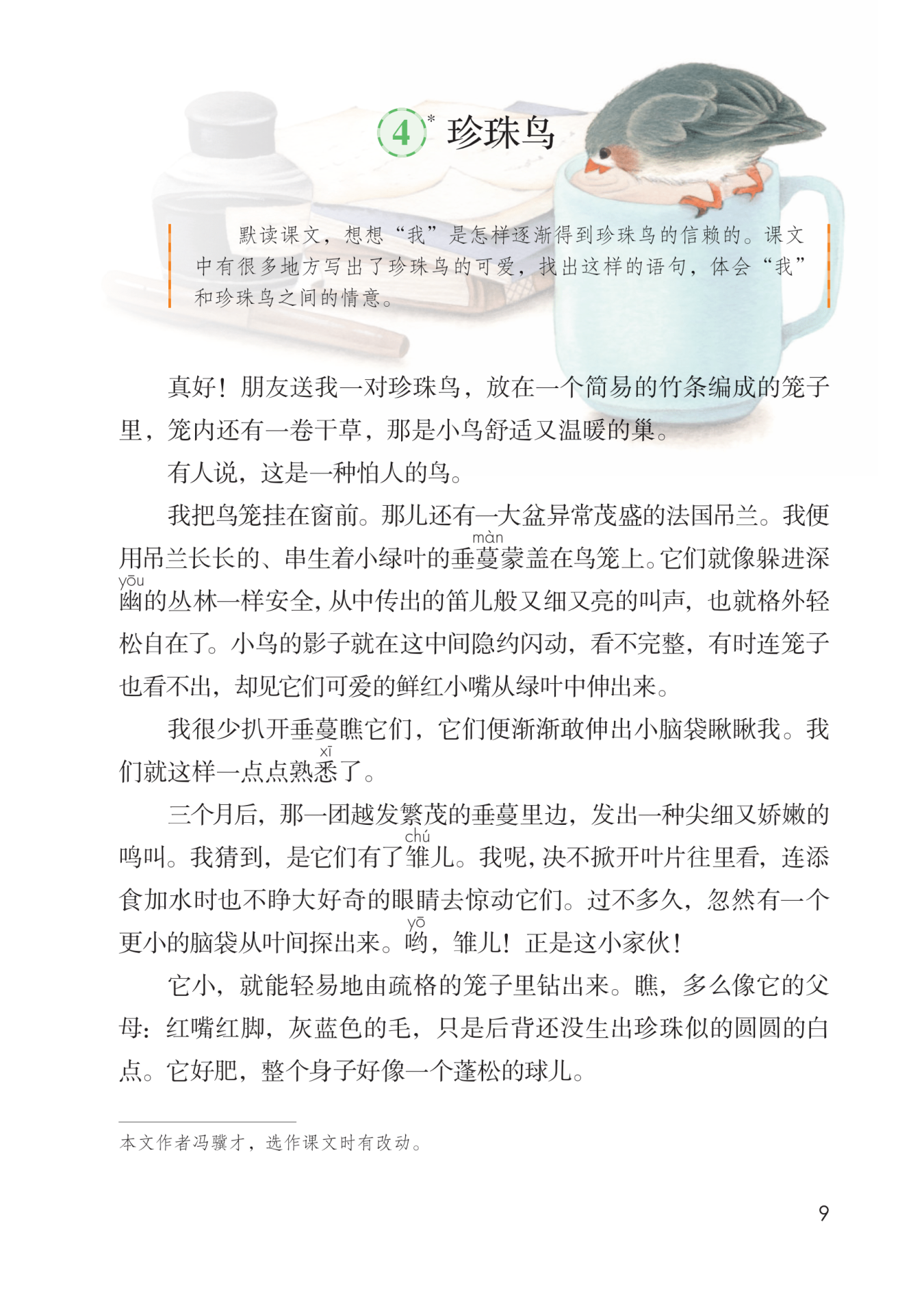 中心思想:本文描述了珍珠鸟在我的细心照料,精心呵护下,由害怕
