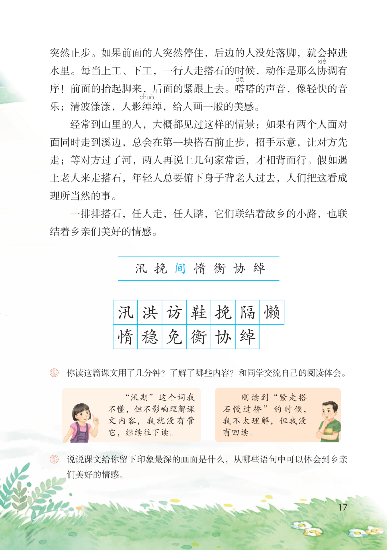 我读这篇课文用了2分钟。我了解的内容有:①什么是搭石。②走搭石的时候要快走。③人们走搭石时相互谦让,年轻人会背老人走搭石。④搭石联结着乡亲们美好的情感。