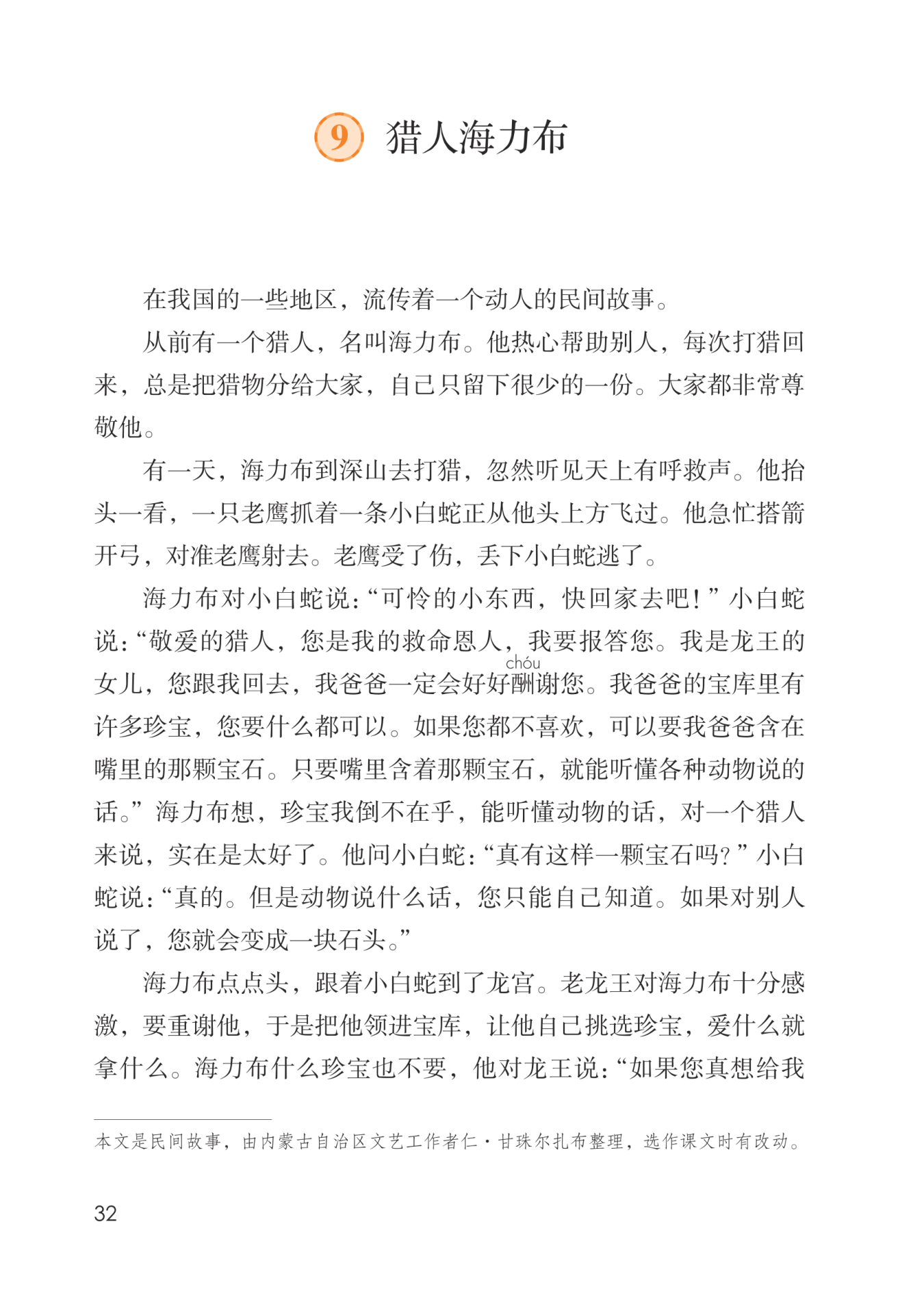 故事的开端:海力布打猎时救了一条小白蛇。