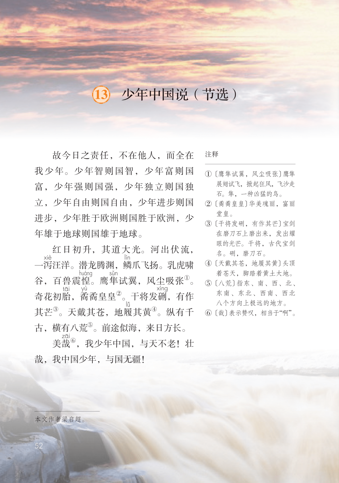 中心思想:《少年中国说(节选)》讴歌了祖国未来的英姿及光辉灿烂的前程,