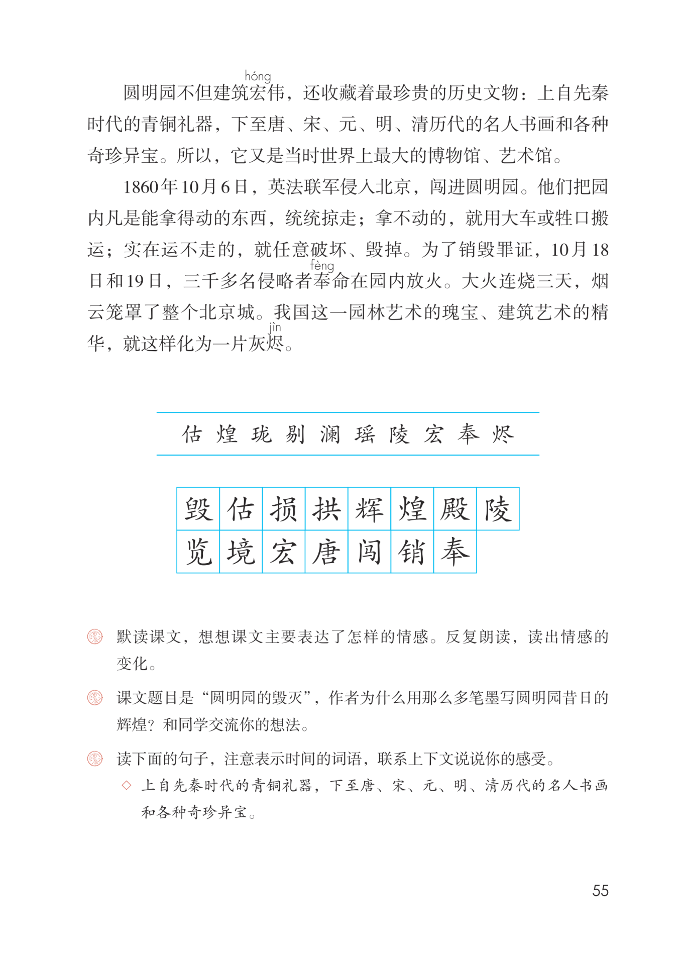 第二句话中表示时间的词语有:1860年10月6日、10月18日和19日。这句话中的时间节点表明侵略者的野蛮行径速度之快,让我体会到英法联军的残暴与野蛮,激起我对其罪恶行径的无比憎恨之情。
