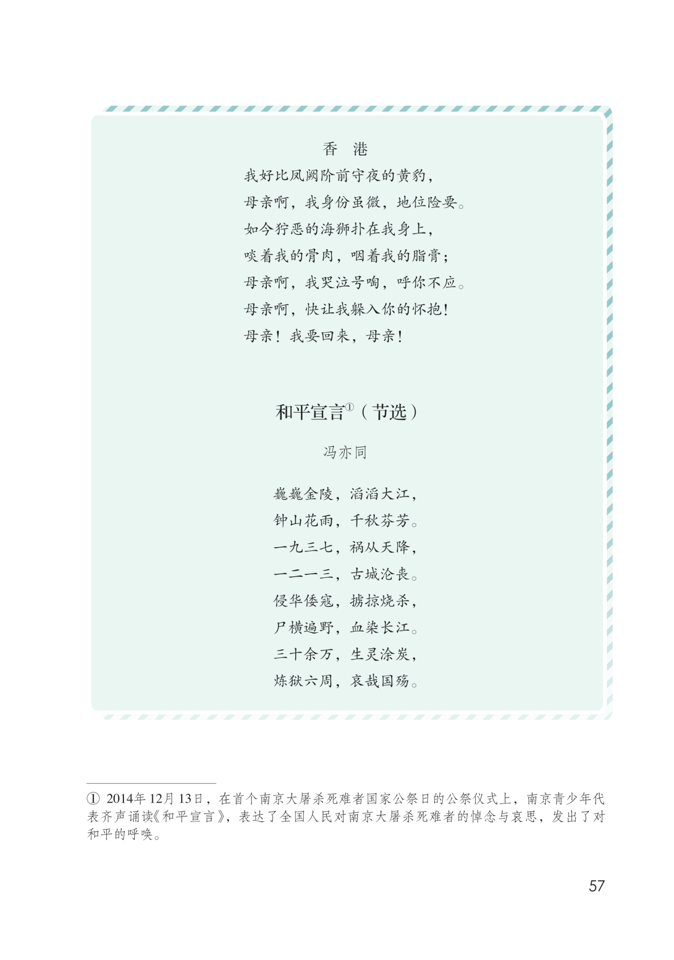 《七子之歌》一方面抒发 了闻一多对祖国的怀念和 赞美,一方面表达了他对 西方列强的憎恶。《和平 宣言》表达了作者对列强 侵略行为的痛恨,对南京 大屠杀死难者的悼念与哀 思,同时发出了对和平的 呼唤。《圆明园的毁灭》 一方面盛赞中国古代劳动 人民的智慧,正是中国古 代劳动人民的智慧才创造 出了这座“园林艺术的瑰 宝、建筑艺术的精华”; 另一方面也表达了作者对 西方列强的极度憎恶,正 是西方列强的野蛮行径, 才造成了圆明园的毁灭, 造成了这个“世界文化史 上不可估量的损失”。由 此可见,课文与阅读链接 中的诗歌在表达情感上的 相似之处是:对祖国的赞 美和对西方列强的憎恶, 以及对和平的热爱。