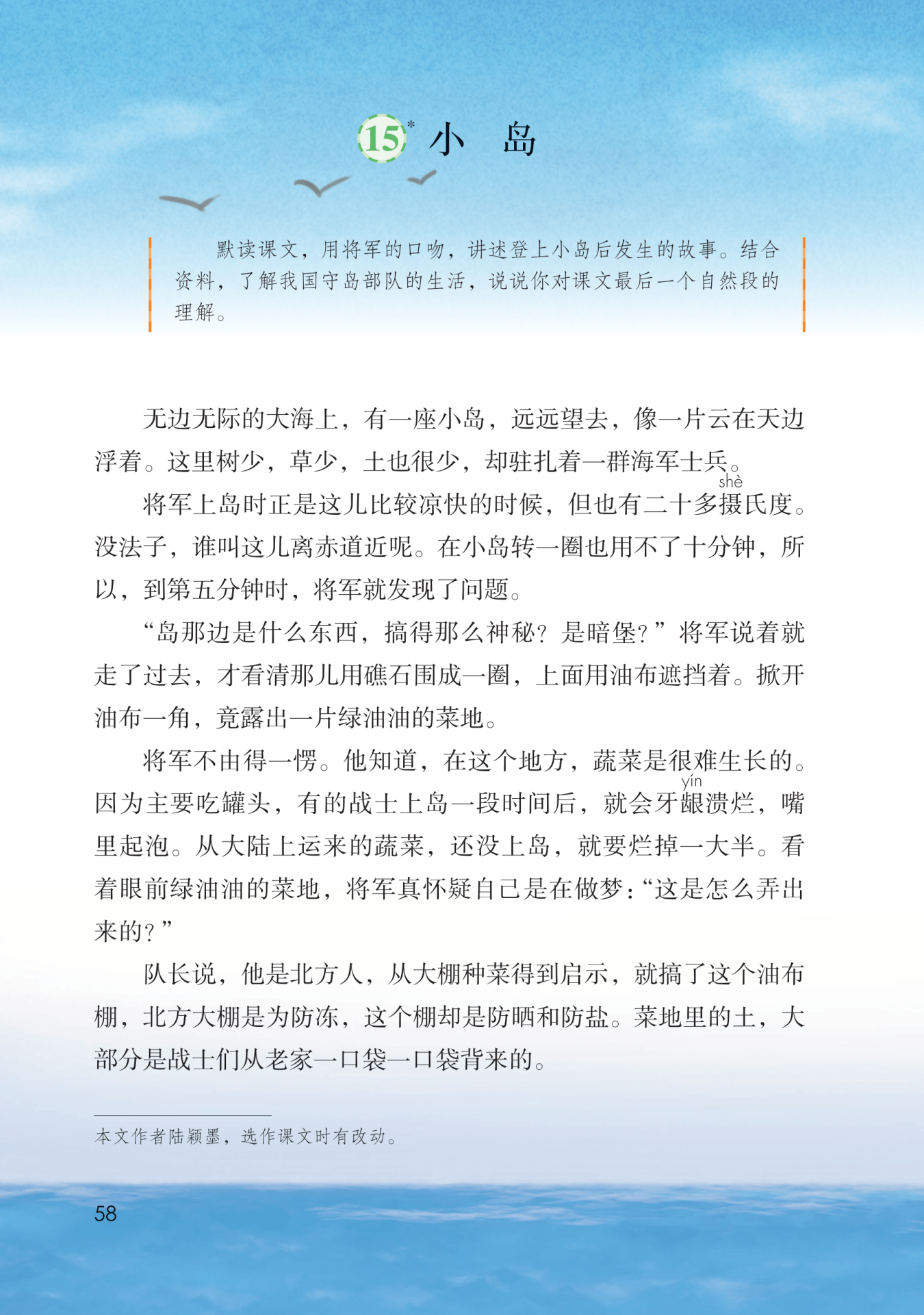 写出小岛的“小”。而将军在“到第五分钟时”就发现了问题,说明将军对岛上的情况很了解,下文将军对战士们的体贴和关爱便顺理成章了。