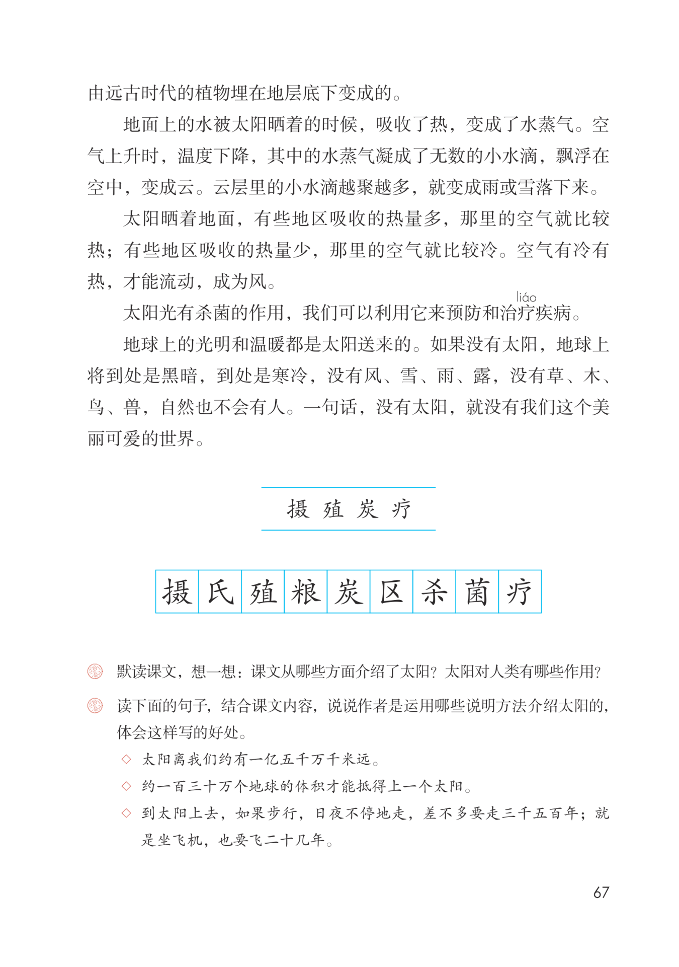 课文从太阳距离地球远、体积大、温度高三个方面介绍了太阳。动植物的生长和能源的形成离不开太阳,太阳影响自然气候的变化,太阳光能够预防和治疗疾病。总之,没有太阳,就没有我们这个美丽可爱的世界。