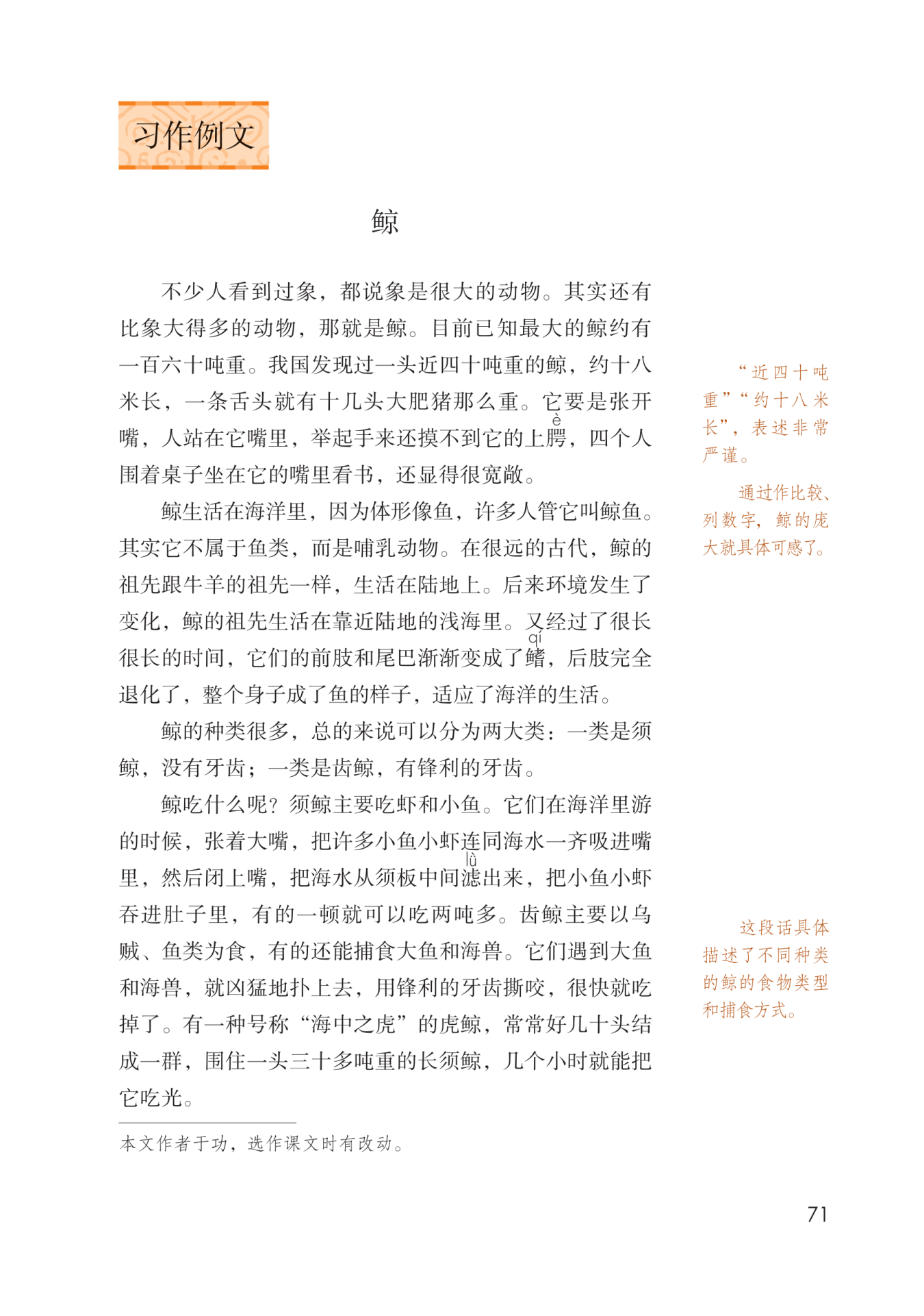 这里作者运用作比较的说明方法,将不熟悉的事物与熟悉的事物相比较,由象“很大”到鲸“比象大得多”,以此来说明鲸之庞大。这样写,给人留下了鲜明的印象。