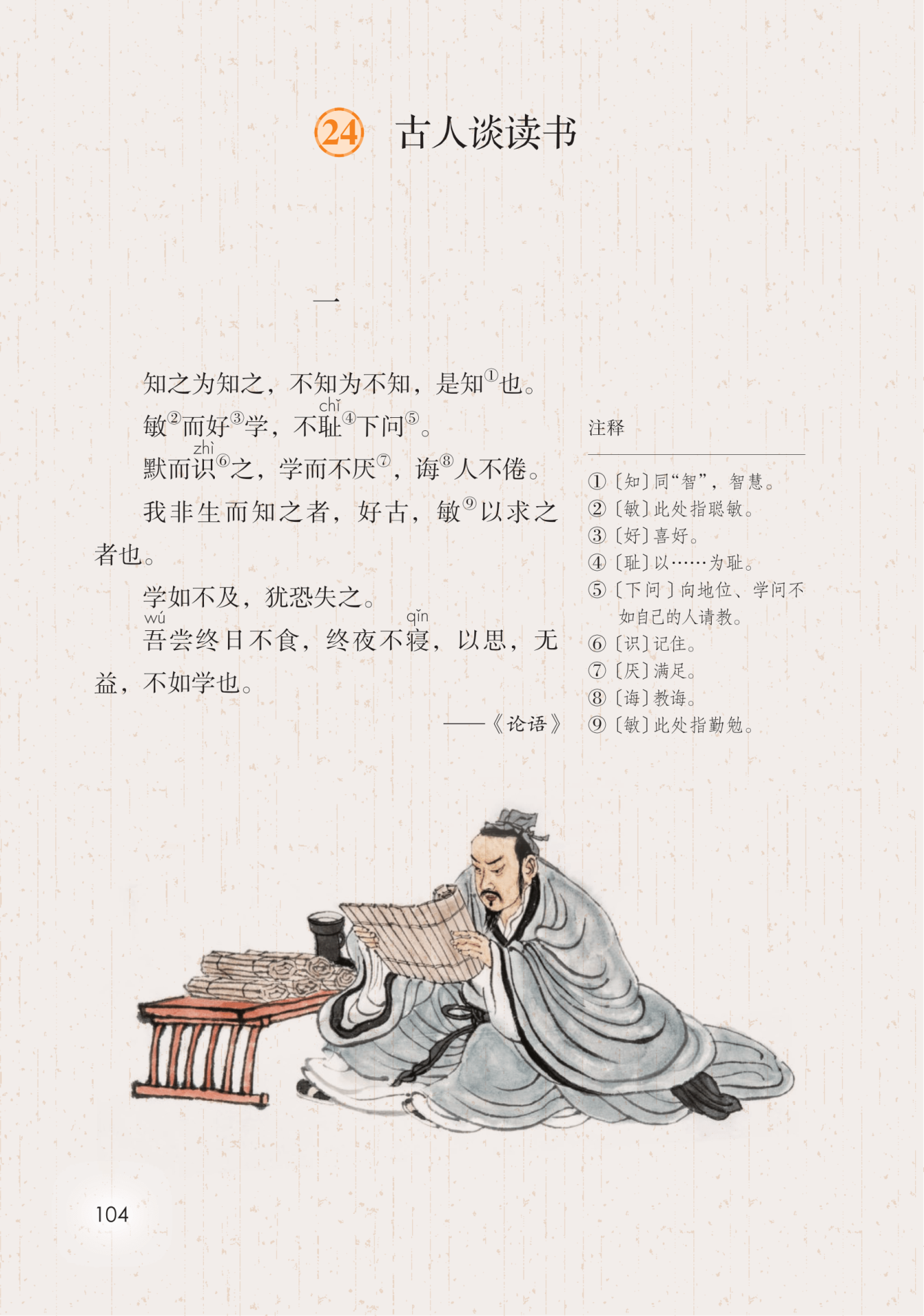 中心思想:(一)选自《论语》,主要讲的是学习的态度和方法。告诫我