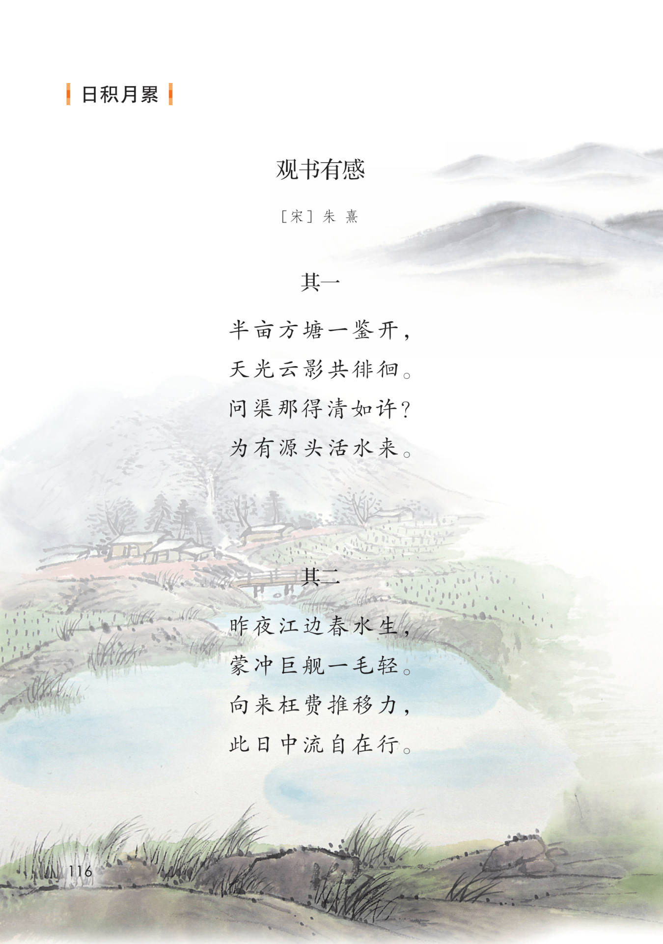 赏析:这是一首借景喻理的名诗。 全诗以方形池塘做比喻,形象地表 达了一种微妙难言的读书感受。前 两句是景物描写。“半亩方塘”虽然 不算大,但它却像一面镜子那样澄 澈明净,“天光云影”都被它倒映出 来了。这两句描写展现了景物本身 的美感,使人心灵澄净,心胸开阔。 后两句是借景喻理。这两句借水之 清澈,是因为有源头活水不断注入, 暗喻人要心灵澄明,就得认真读书, 时时补充新知识。