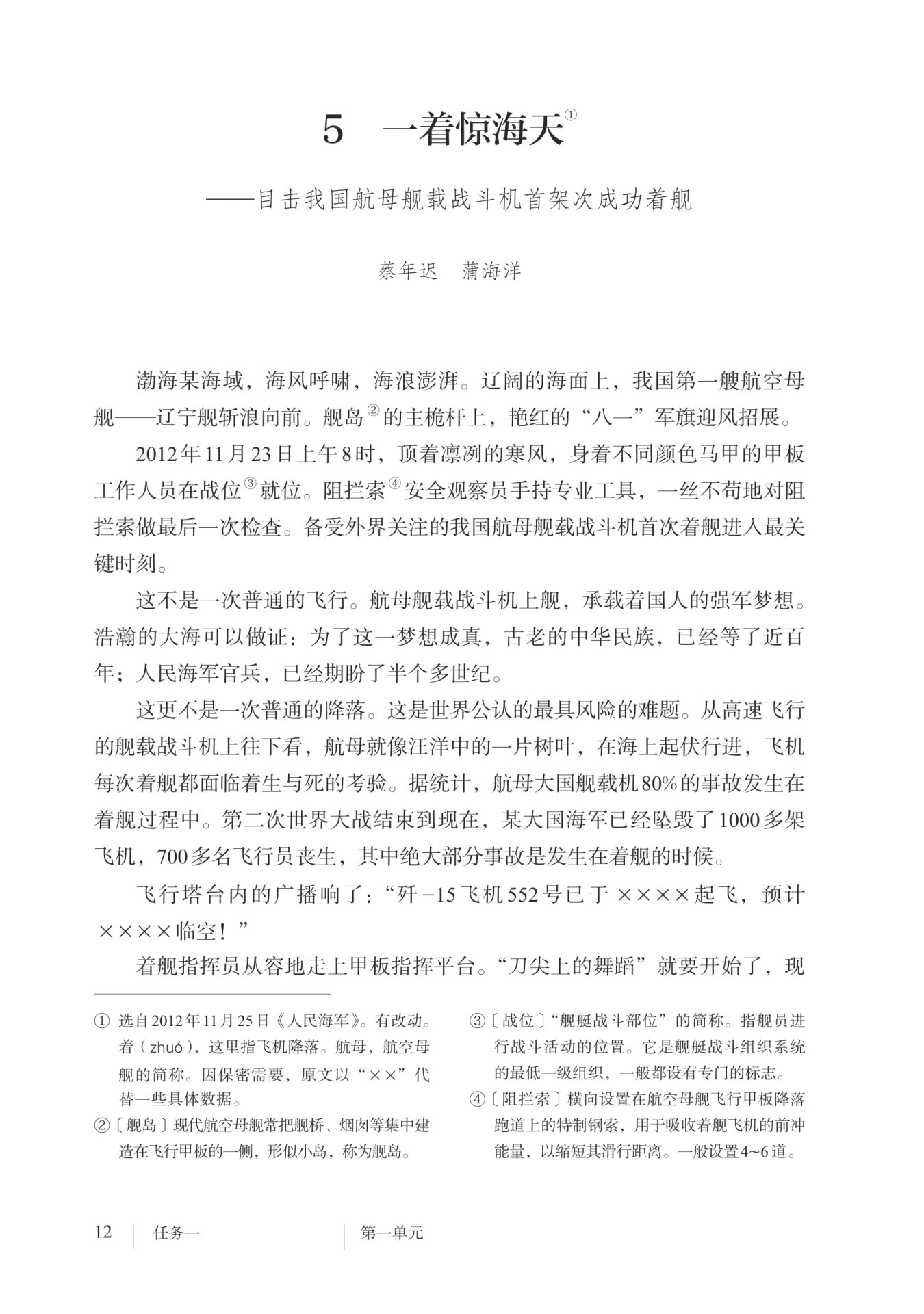 本文生动地再现了我国航母舰载战斗机首架次成功着舰的过程,赞美了中国军人